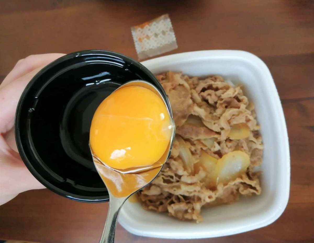実は、牛丼の甘辛いタレが大好きな私は、卵をかけると薄くなってしまうから今まで敬遠していました。