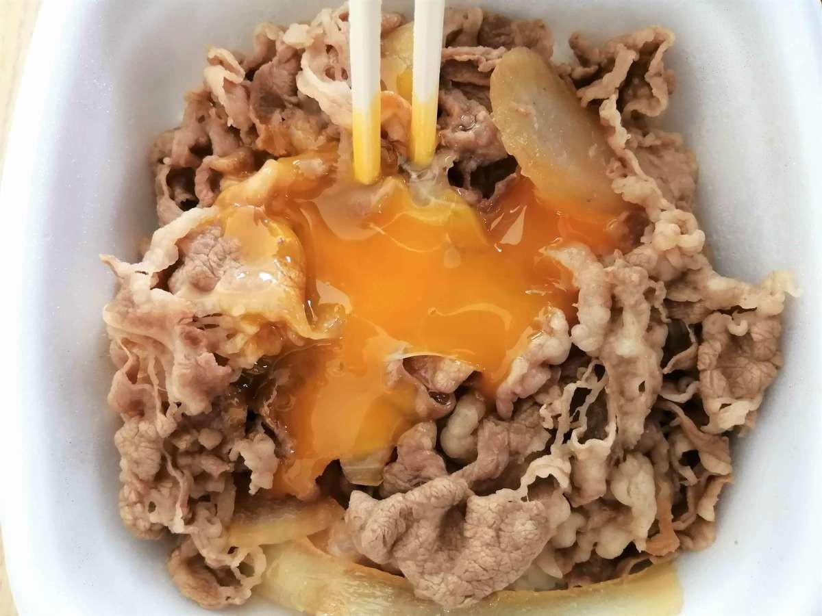 吉野家牛丼の美味しい食べ方①牛肉に卵黄をのせて絡める