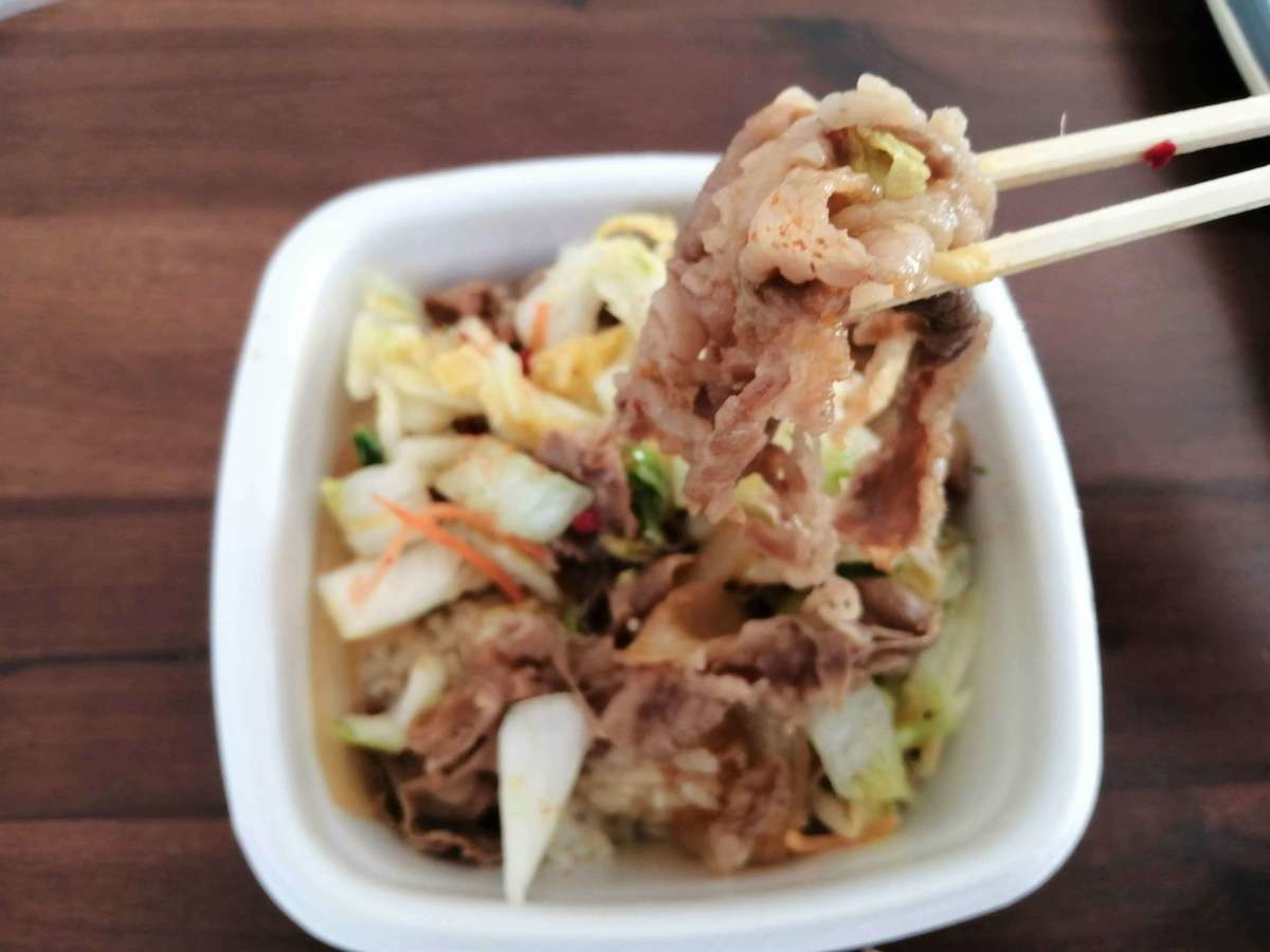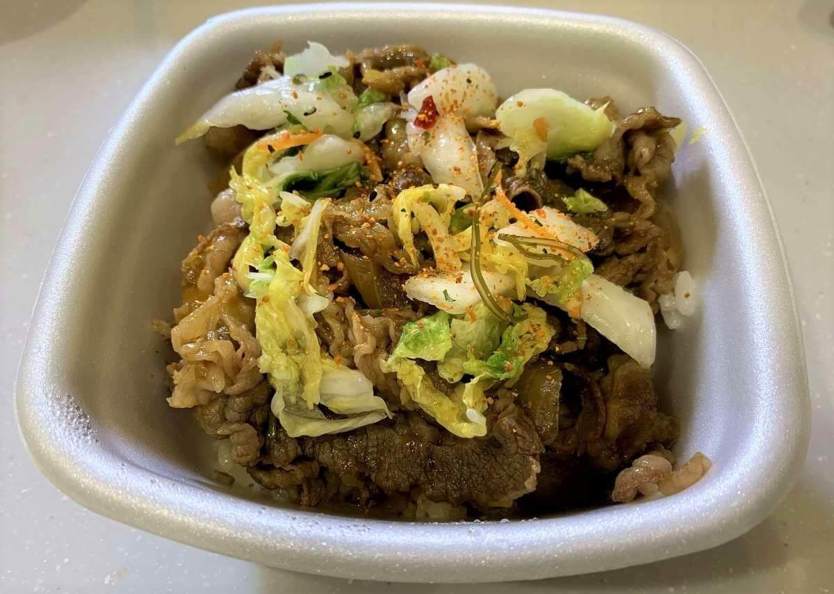 牛丼の上にどどんとお新香をのせ、七味をふりかけたら完成!どんな味なのでしょうか。