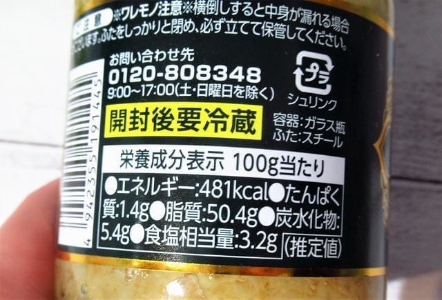 栄養成分表示:100gあたり エネルギー:481㎉/たんぱく質:1.4g/脂質:50.4g/炭水化物:5.4g/食塩相当量:3.2g