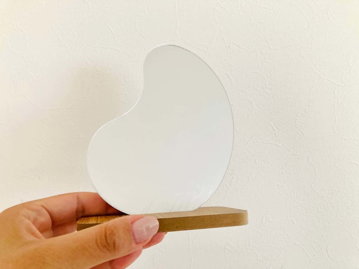 豆のようなフォルムが可愛い「ビーンズミラー 110円(税込)」。たまたま立ち寄ったセリアでは在庫がありましたが、後日寄った別の店舗ではすでに品切れ!見つけたら即ゲットがおすすめです。