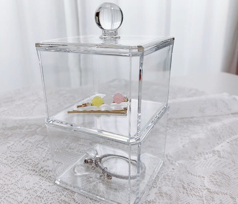 ボックスのクリアとヘアアクセのキラキラは相性抜群。見せる収納にはもってこいです。せっかくのクリアボックスなので、お気に入りのシュシュやリボンを入れても良さそうです。