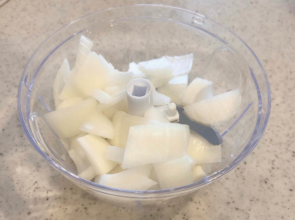 説明書には「みじん切りする野菜を1㎝角くらいにして入れる」と記載してあります。ズボラな私はなんとなく1㎝くらいにして、みじん切り器に投入!