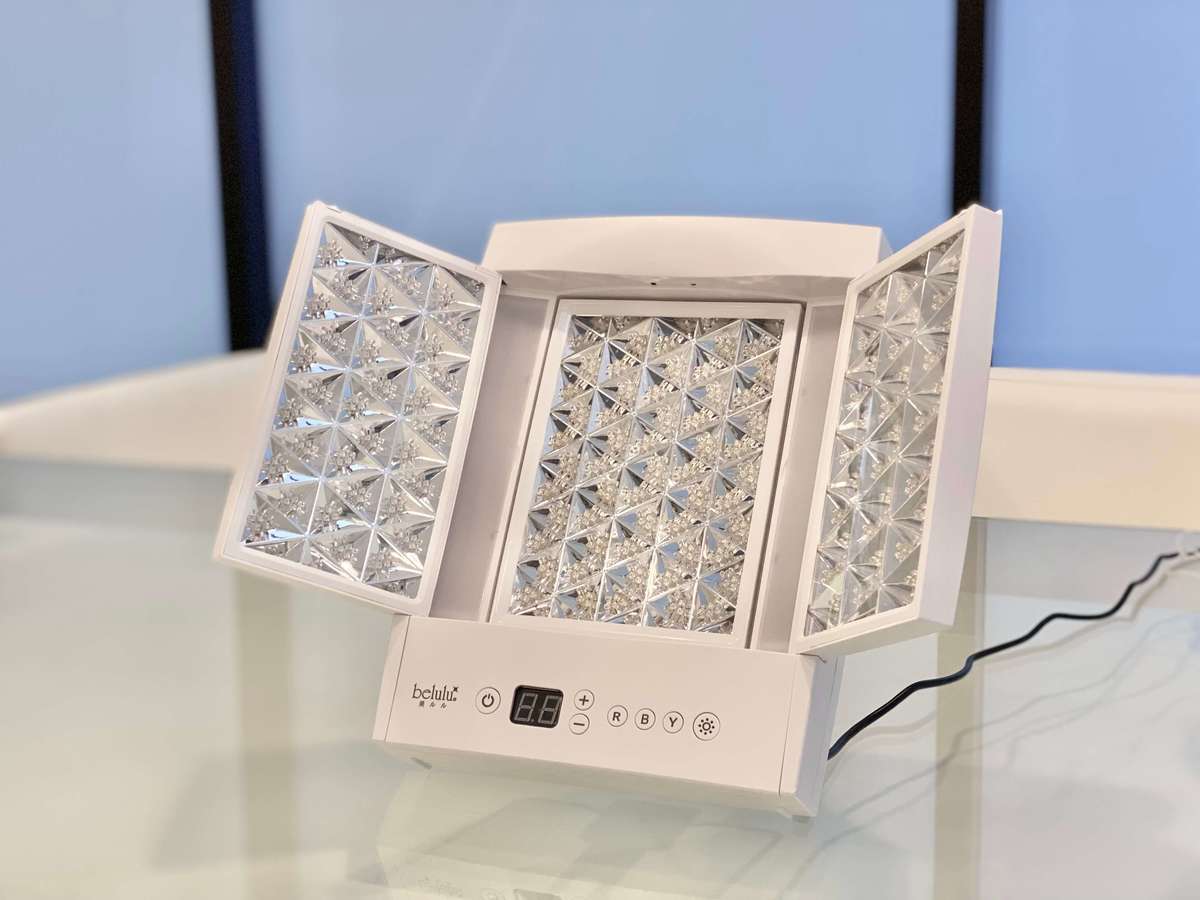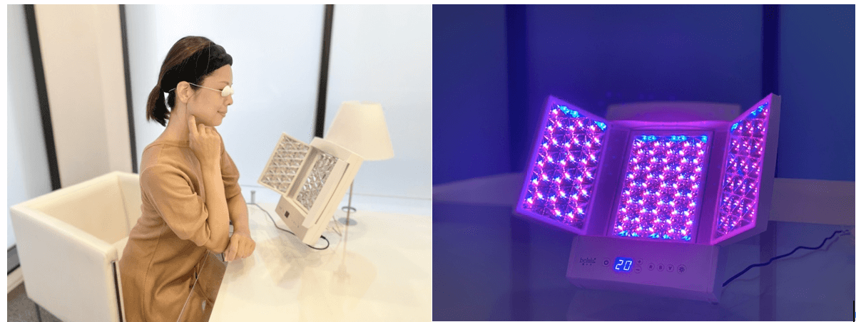 今の自分の課題に合わせ、赤と青の組み合わせの照射「コラーゲン+紫外線ダメージ鎮静化」モードを試してみました。 自宅の照明に合わせた光に調節でき、どんな部屋でも「おうち美容」ができるカスタマイズ家電です。