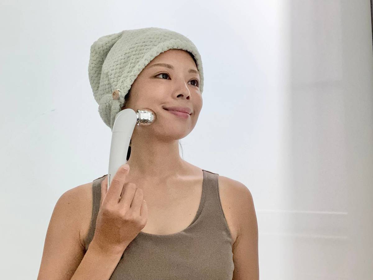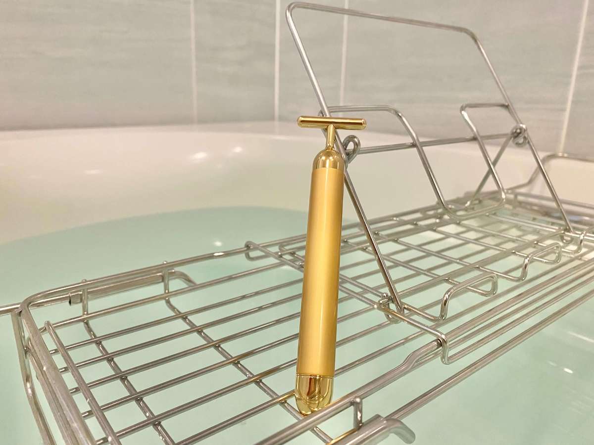 金属製が多く、浴室で使える美顔器がなかなかなく探していた兼坂さん。乾燥肌がひどいので、夏のおうち美容にとって大切な「夜時間」に、美容液でケアと一緒にケアしたい、と借りたのが、「美容家電 美顔器 ビューティーバー ミニマム」です。