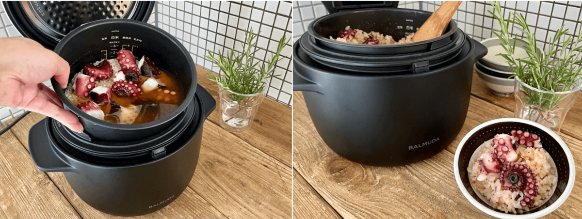 蒸気で炊き上げるため、タコが柔らかくごはんもふっくらして、旨みがそのまま出ているようなおいしさで大満足です。中蓋も簡単に外して洗えるので、お手入れもラクです。水や具合に応じた炊き加減が難しい、土鍋とほぼ同じ味わいが手間無しで楽しめました。(yukiisutarさん)