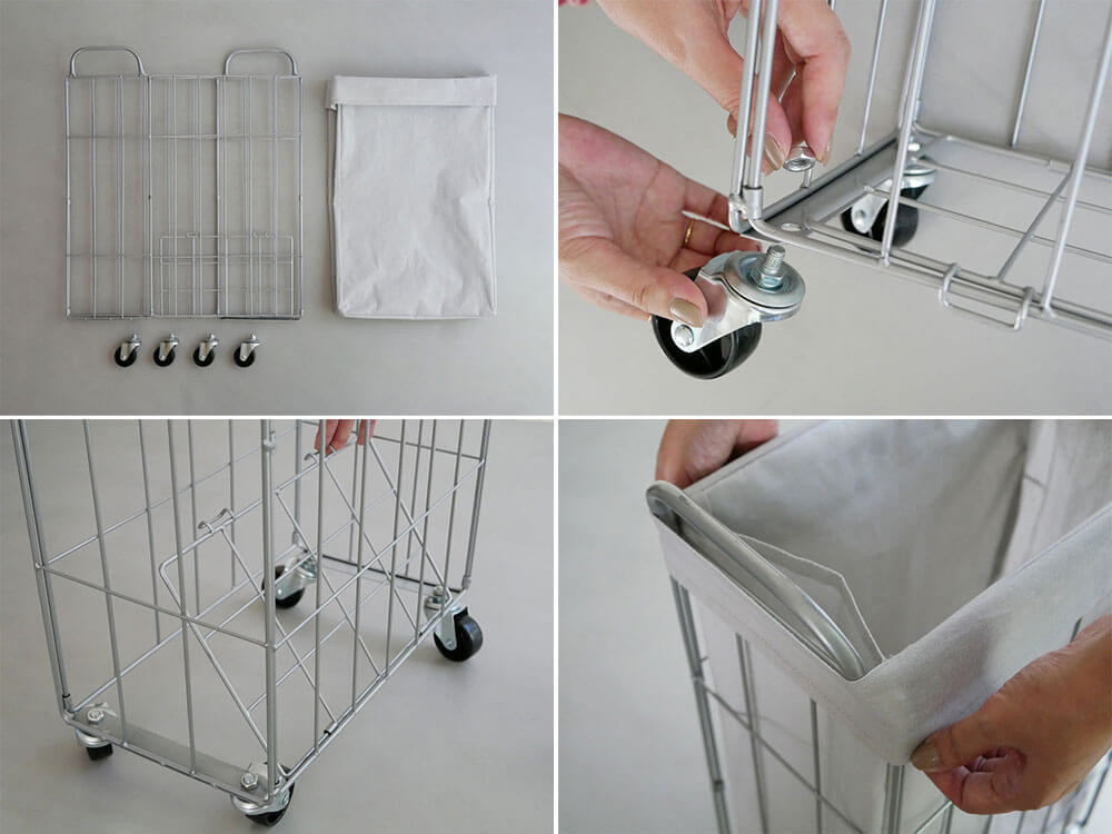 キャスターをバスケットの底面にある取付穴に回して取り付けてください。キャスターの取り付け穴は、バスケットの内側に収まっているのでキャスターを取り付けなくても安定して置くことができます。