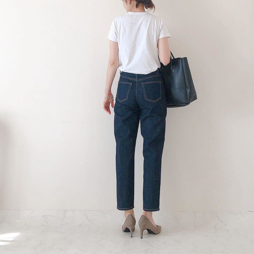 引き締まって見えるネイビーカラーのジーンズは、大人のきれいめコーデにも使いやすい優れモノ。