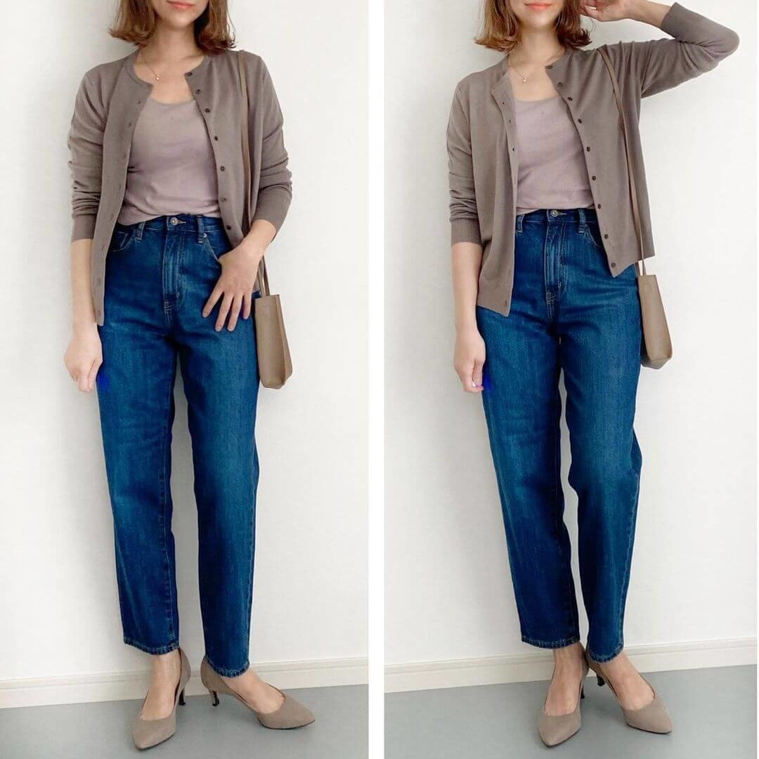 ユニクロのクルーネックカーディガンを着こなした、シンプルできれいめスタイル。