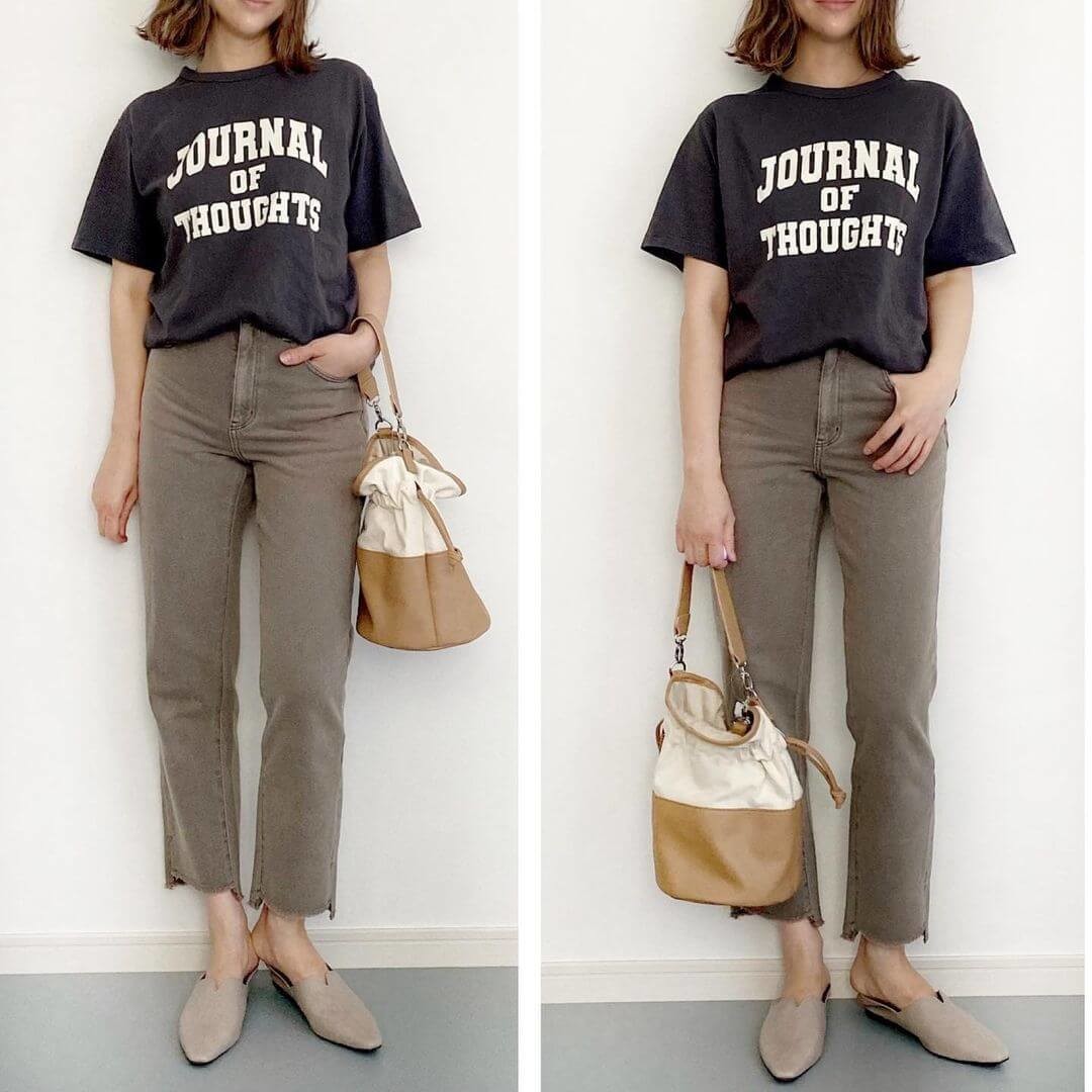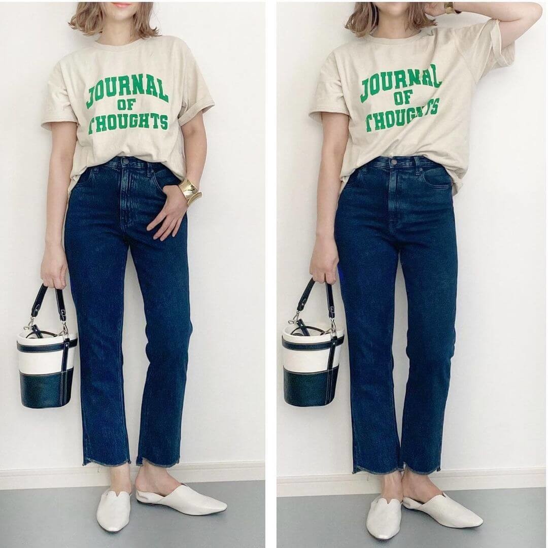 それではGUのカットオフジーンズにカレッジロゴTを使った、アレンジコーデを見ていきましょう!