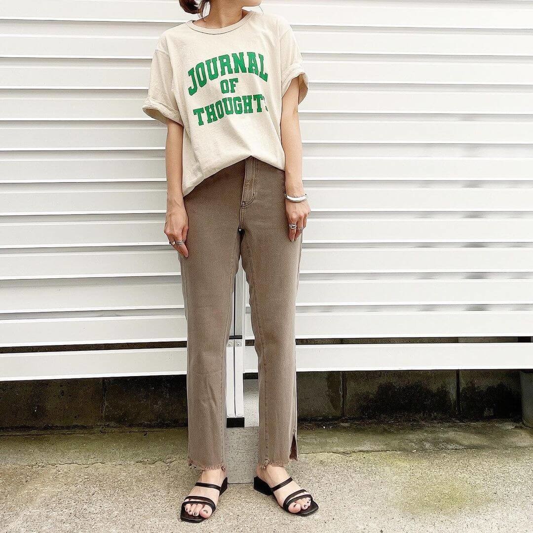 カレッジロゴTと合わせたラフなルックスに華奢なサンダルを履いて、フェミニンさも忘れずに。