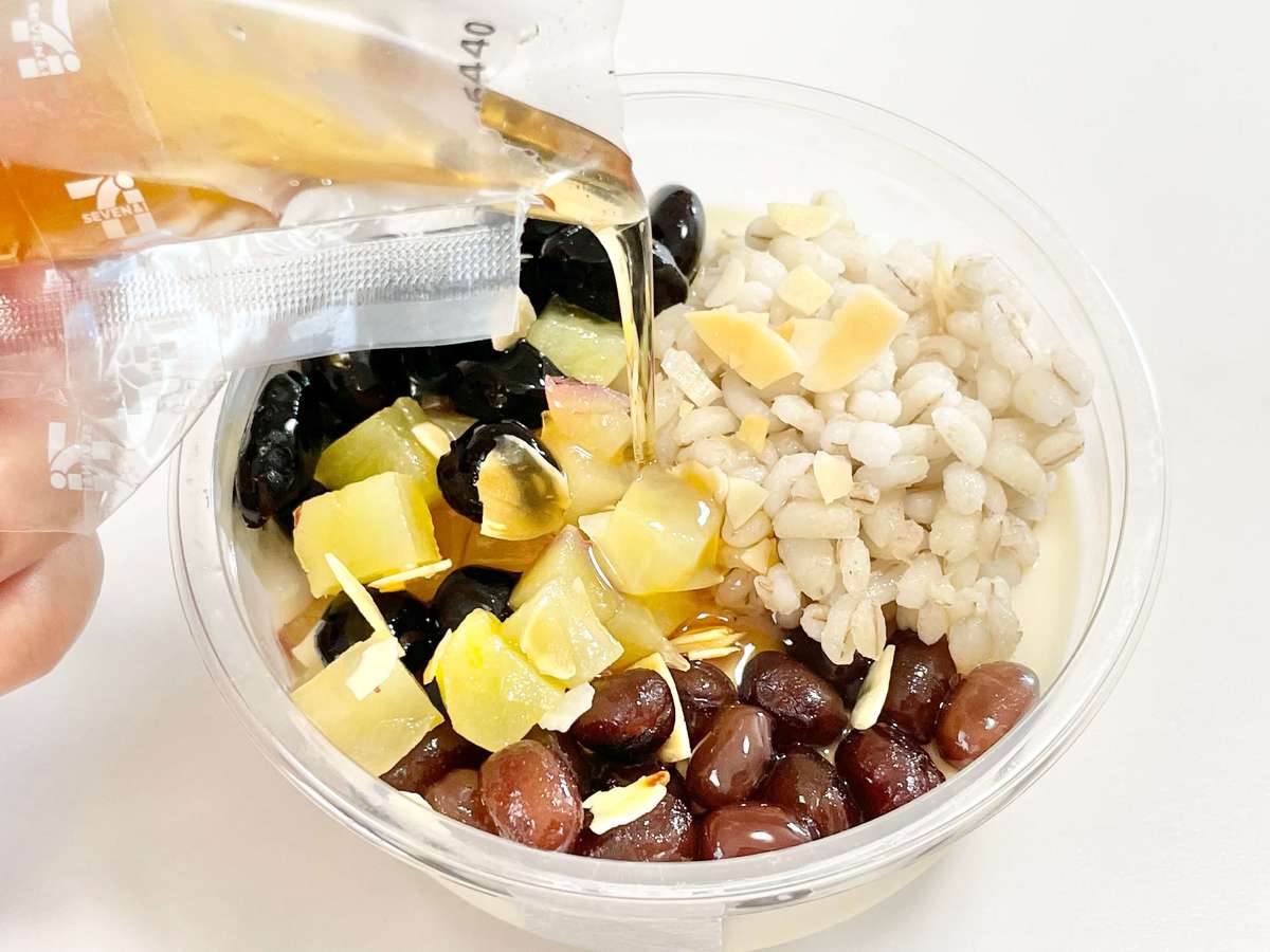 5種の具材をのせ、別添の黒糖シロップをかけて食べます。