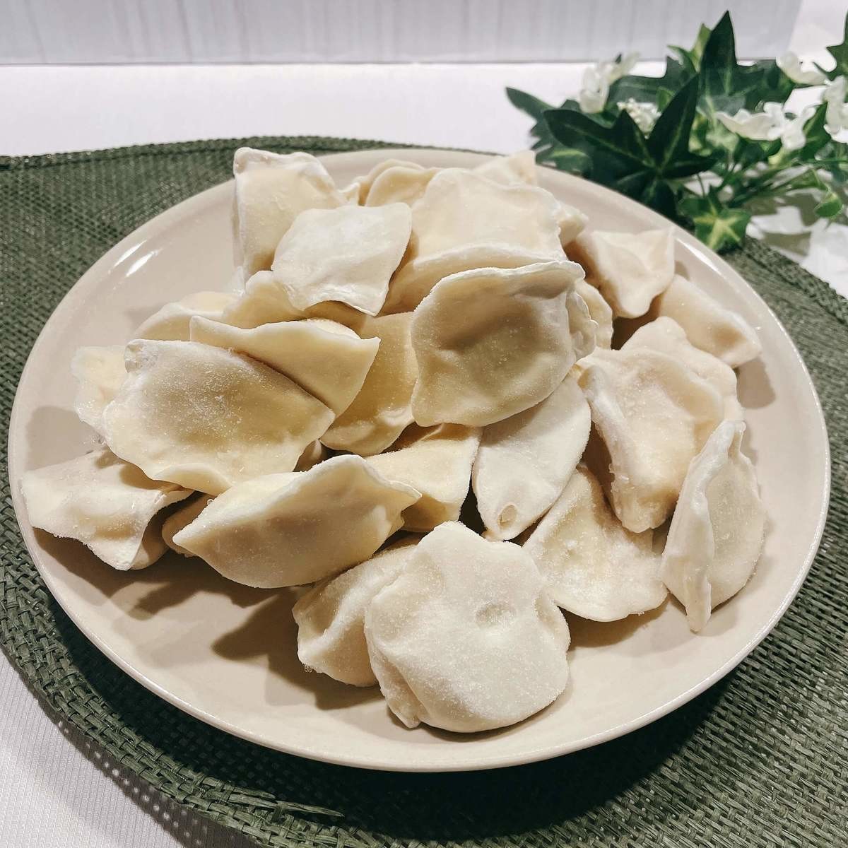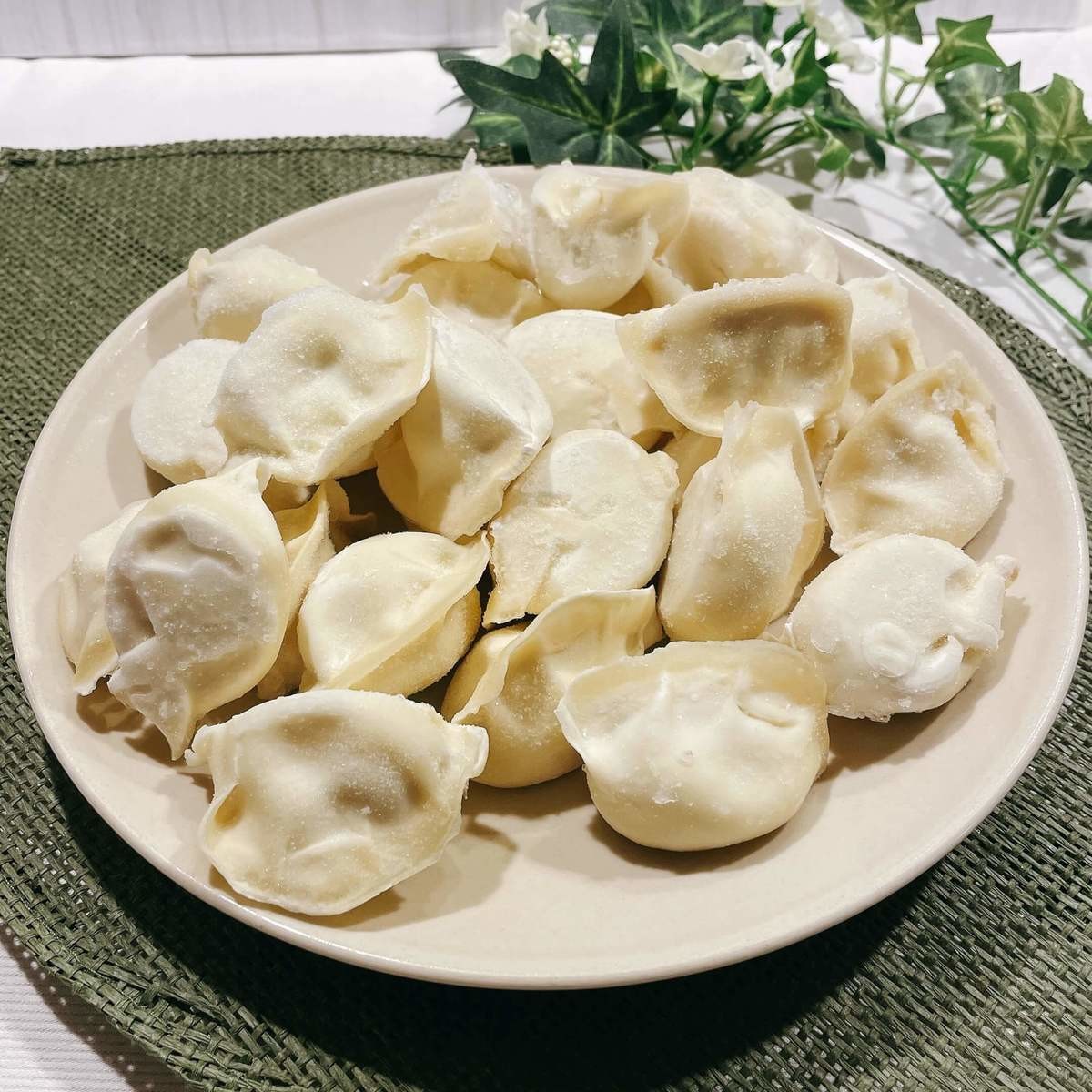 中身を出してみるとお皿いっぱいに冷凍された水餃子が出てきました。
