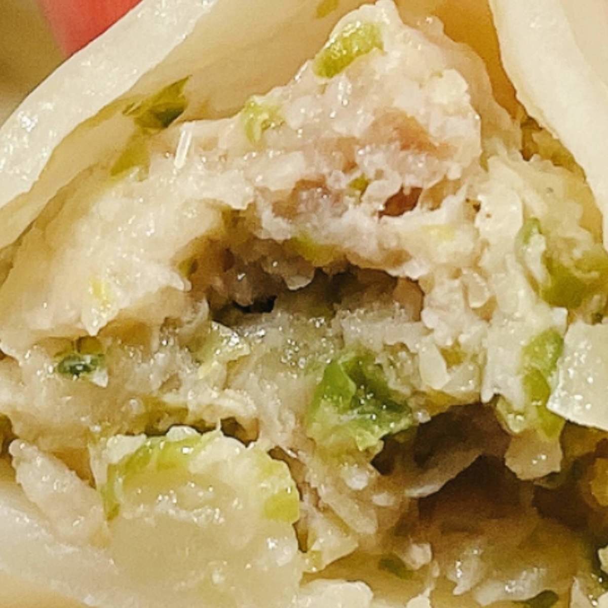 豚肉の中に細かく刻まれた野菜が入っています。