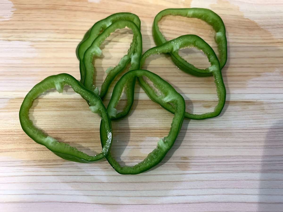 ピーマンは種を取り、輪切りにします。
