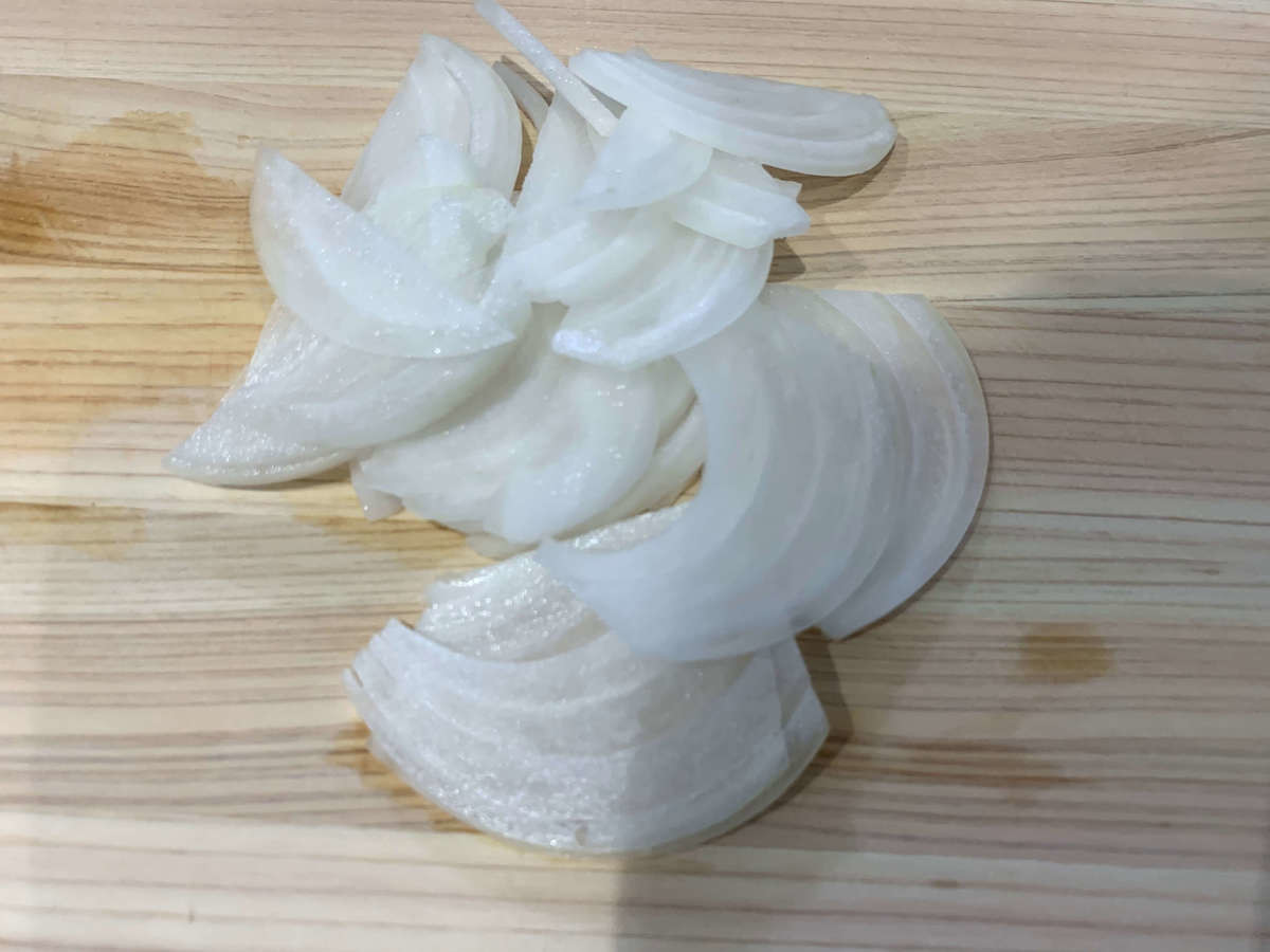 玉ねぎは、薄めのスライスにします。