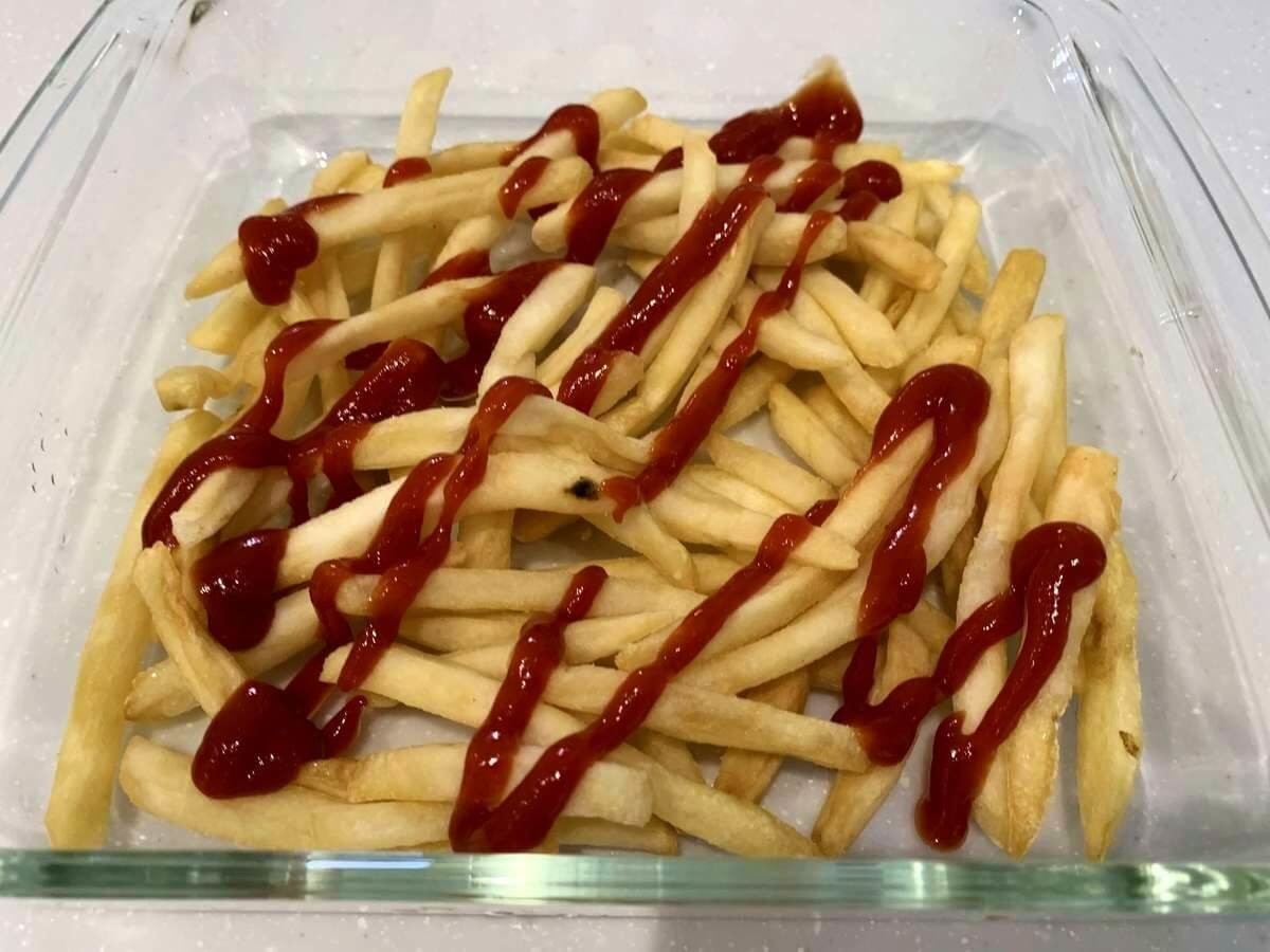 フライドポテトを耐熱容器に並べたら、ケチャップをかけましょう。