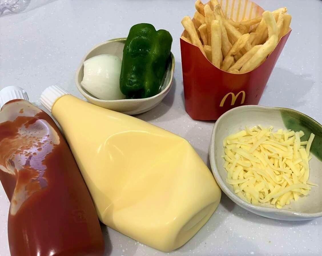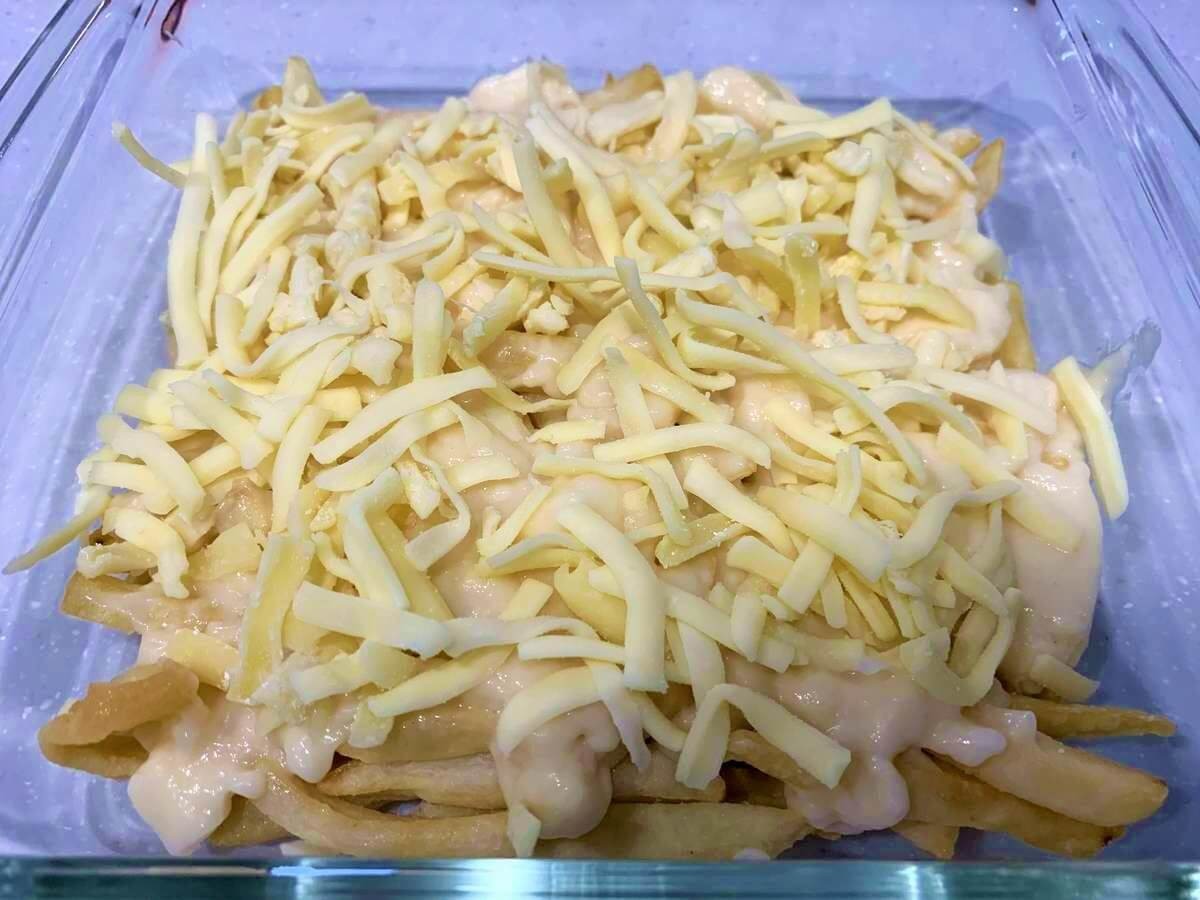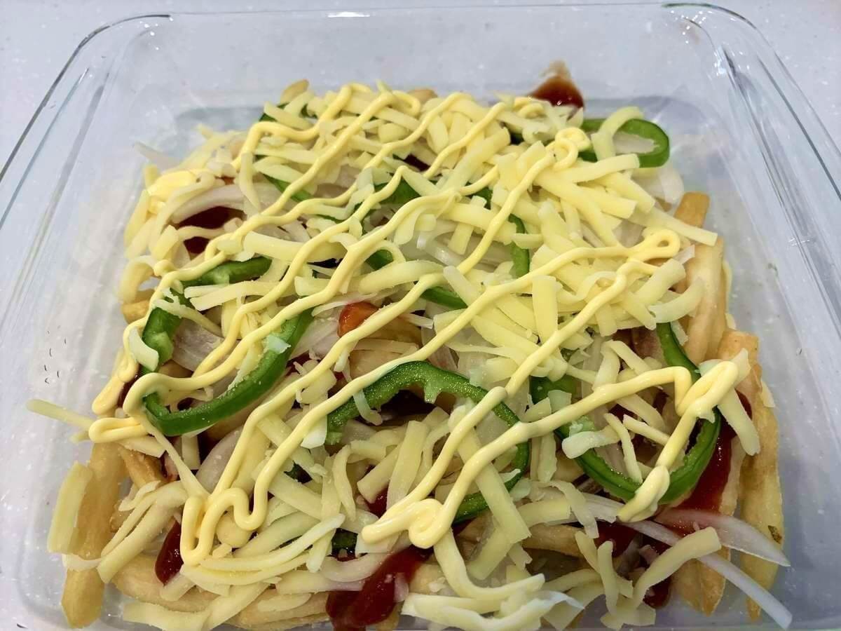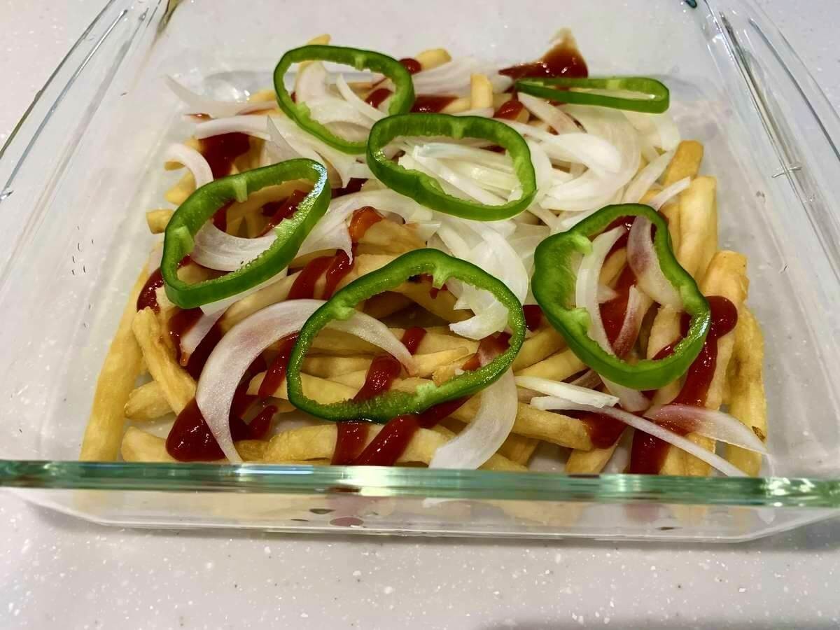 切った玉ねぎとピーマンをフライドポテトの上にまんべんなくのせます。