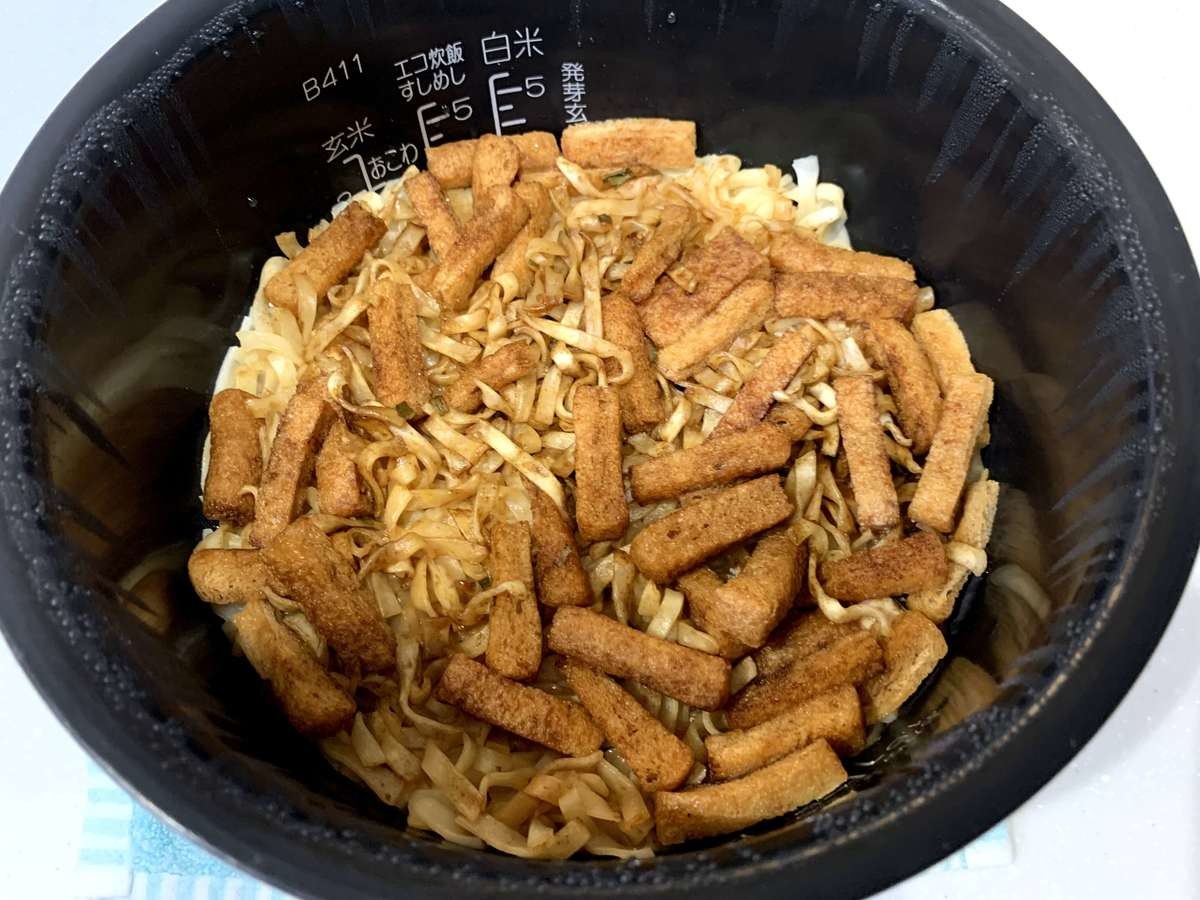 おあげ・砕いた麺・付属のスープを炊飯器に入れ、軽く混ぜたら、炊飯スタート!