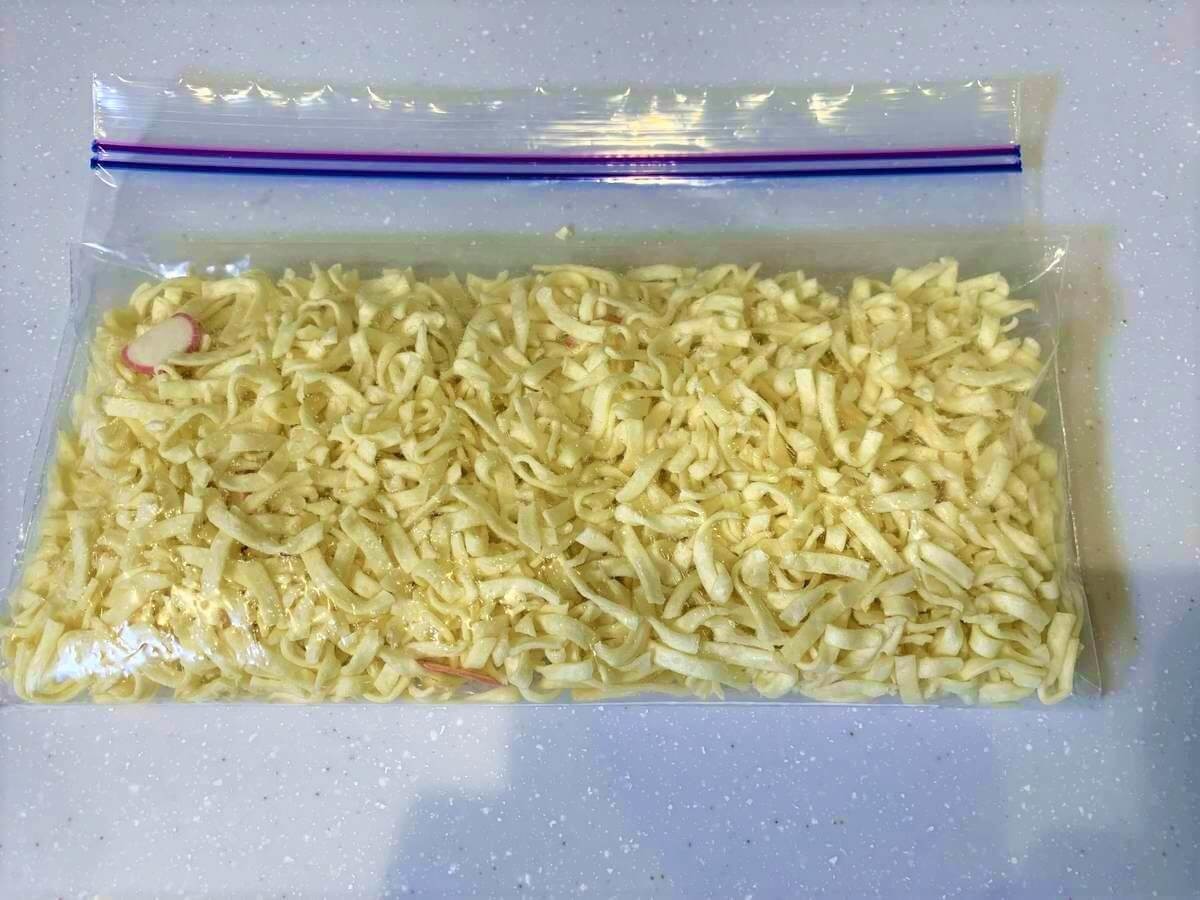 麺を密閉式保存袋に入れたら、麺棒で細かく砕きます。