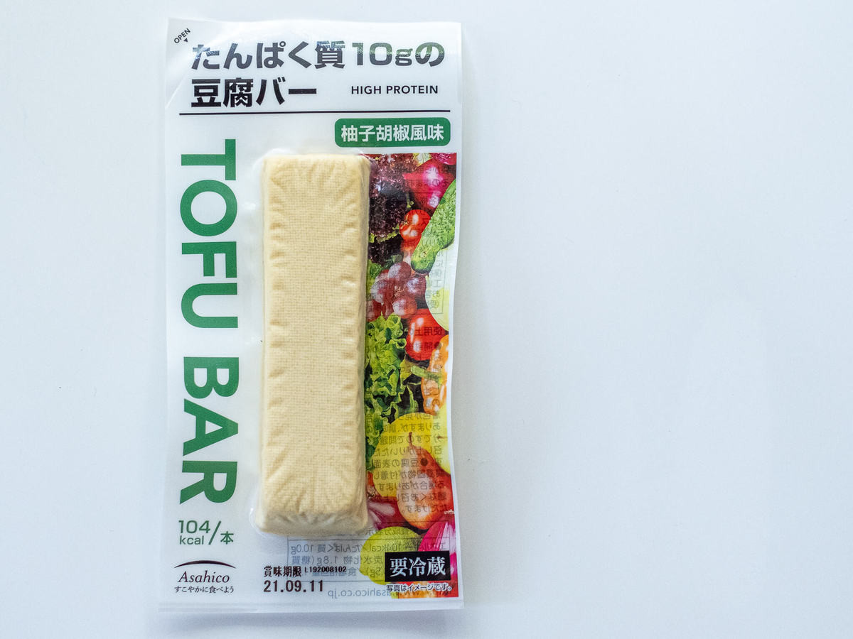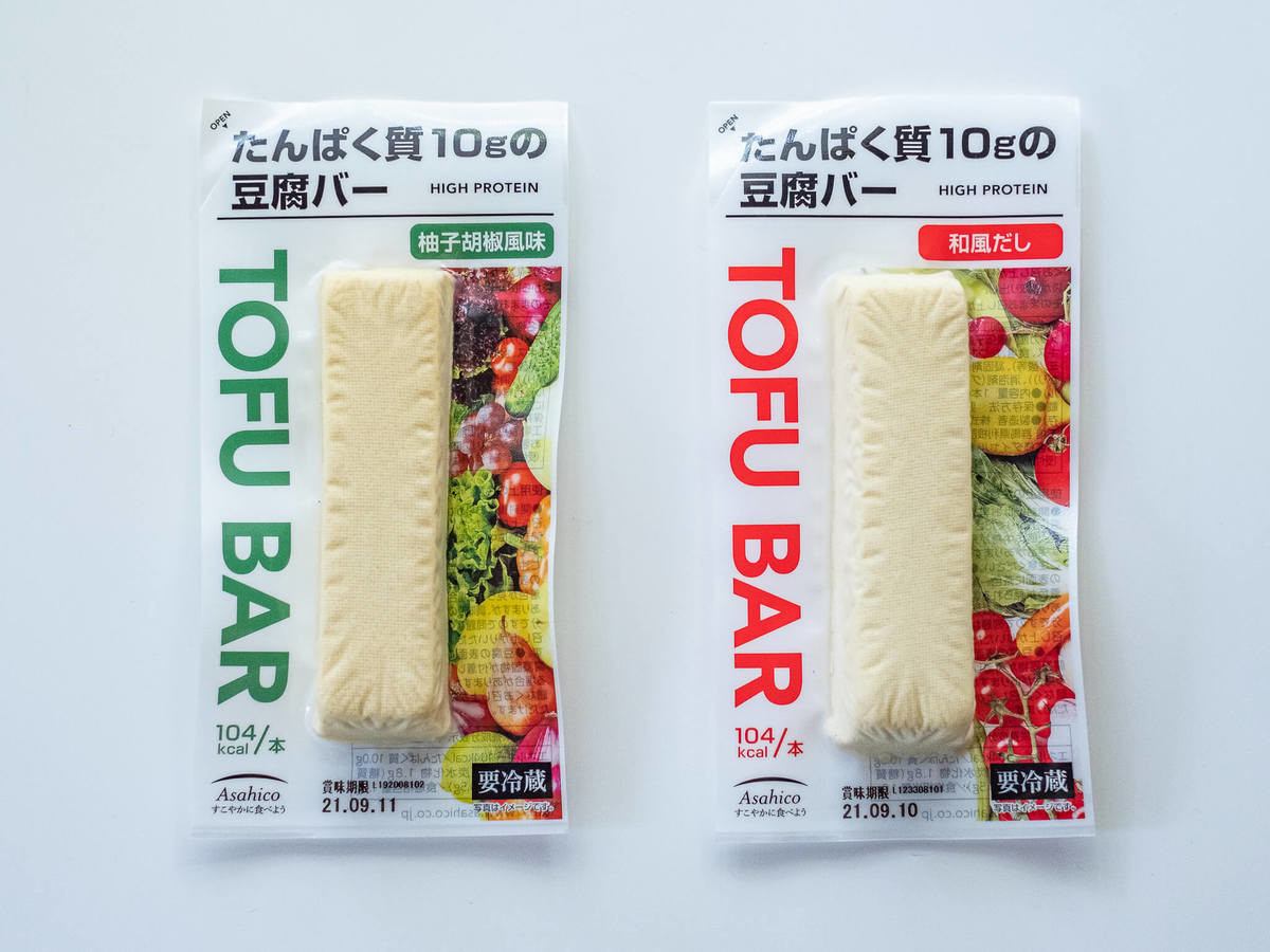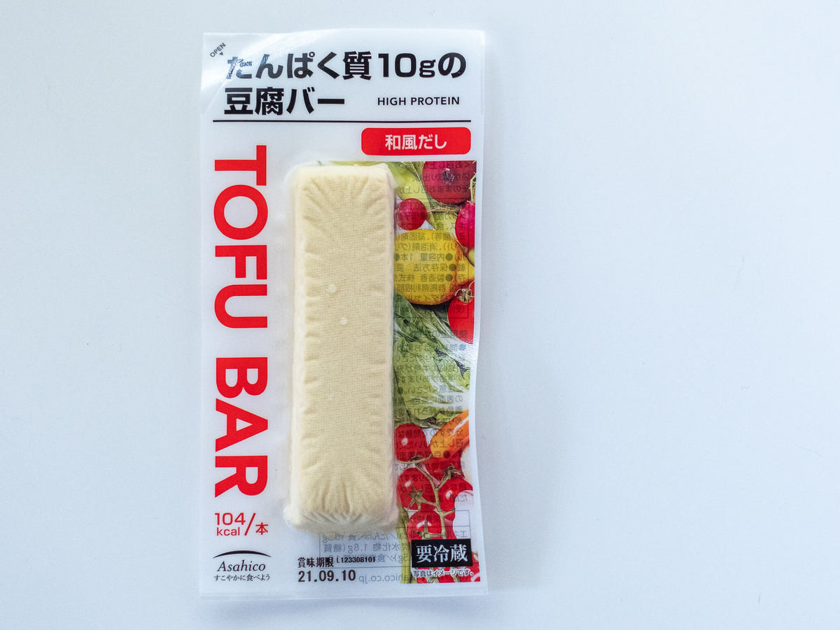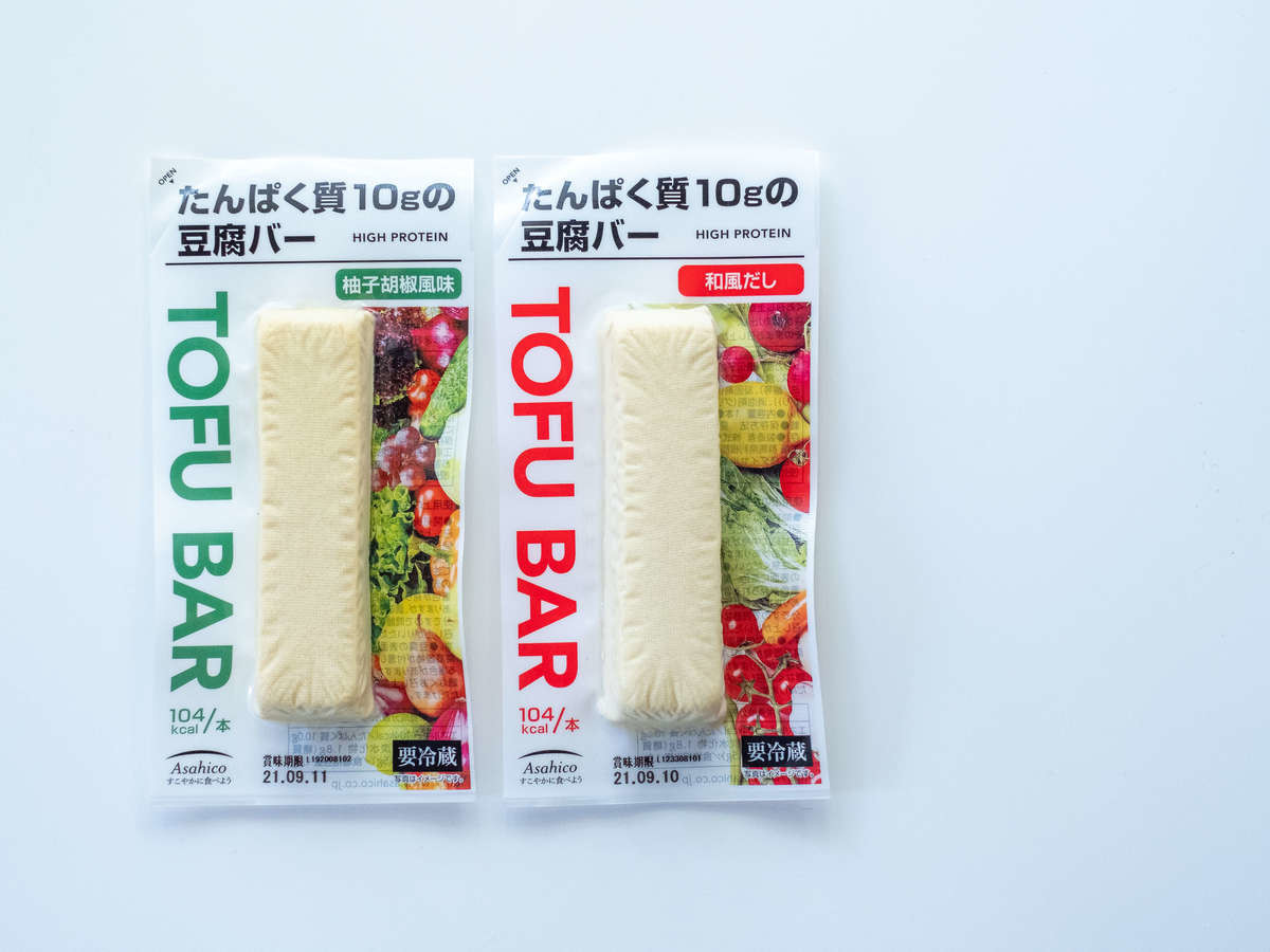今回ご紹介するこちらの「豆腐バー」2種類(和風だし・柚子胡椒風味)は、高タンパク・低カロリーで食べやすく満足感も高い、筆者のイチオシ商品です。