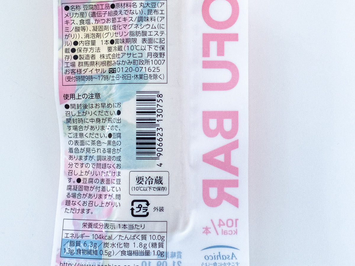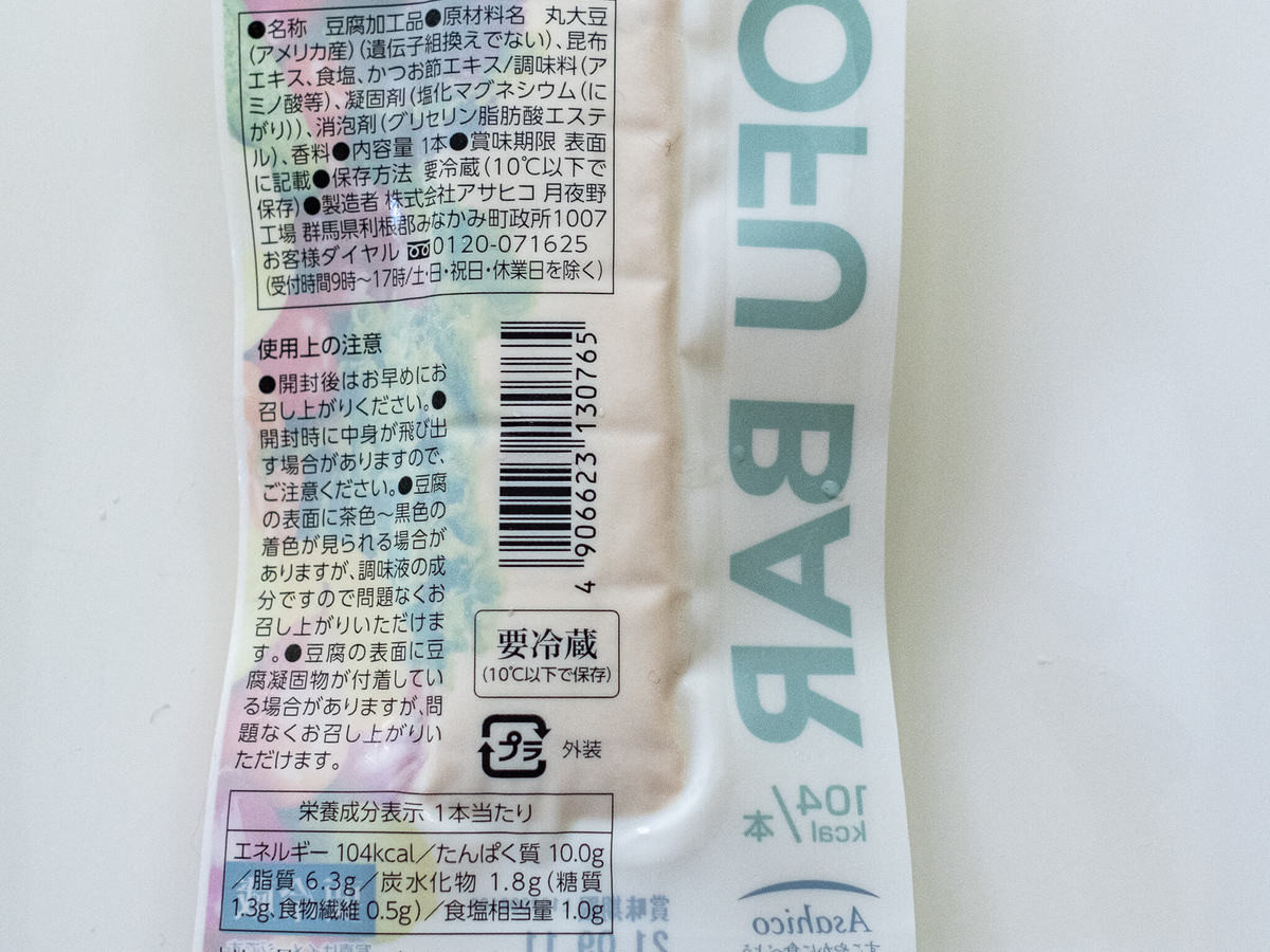 豆腐バーの「和風だし」、気になるカロリーは1本あたり104kcalです。ダイエット中、朝食やおやつにするにも良いのではないでしょうか。