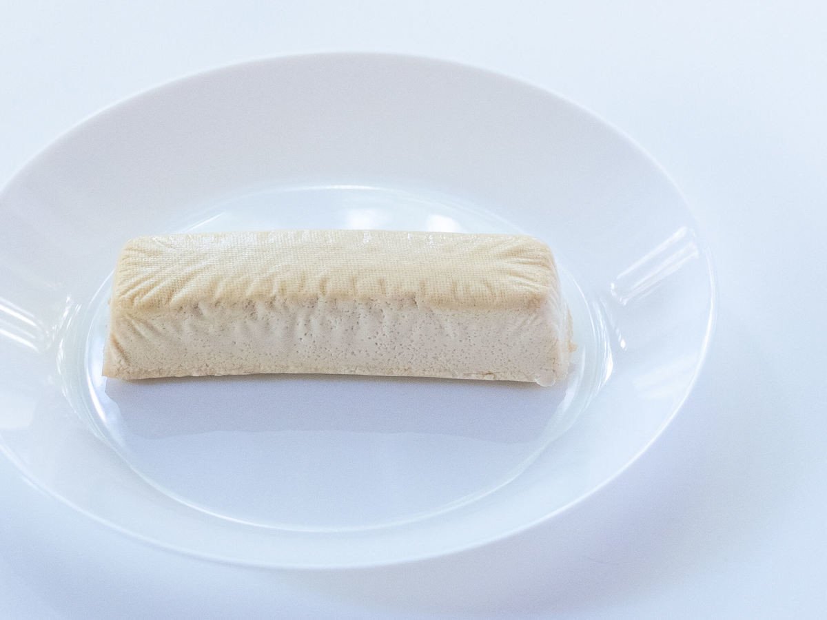 セブンの豆腐バー「柚子胡椒風味」、パッケージから出してみましたが、「和風だし」と見た目も変わらず、特に違いを感じません。