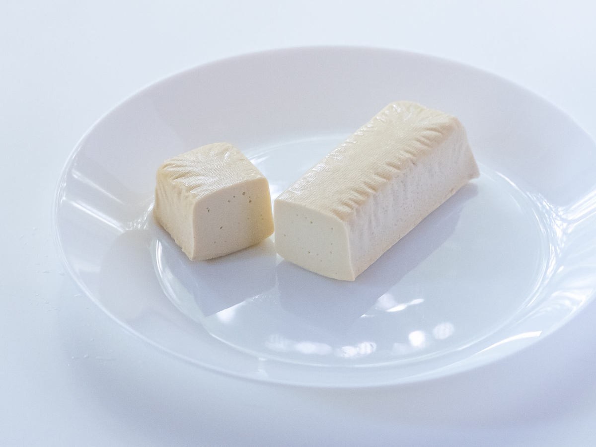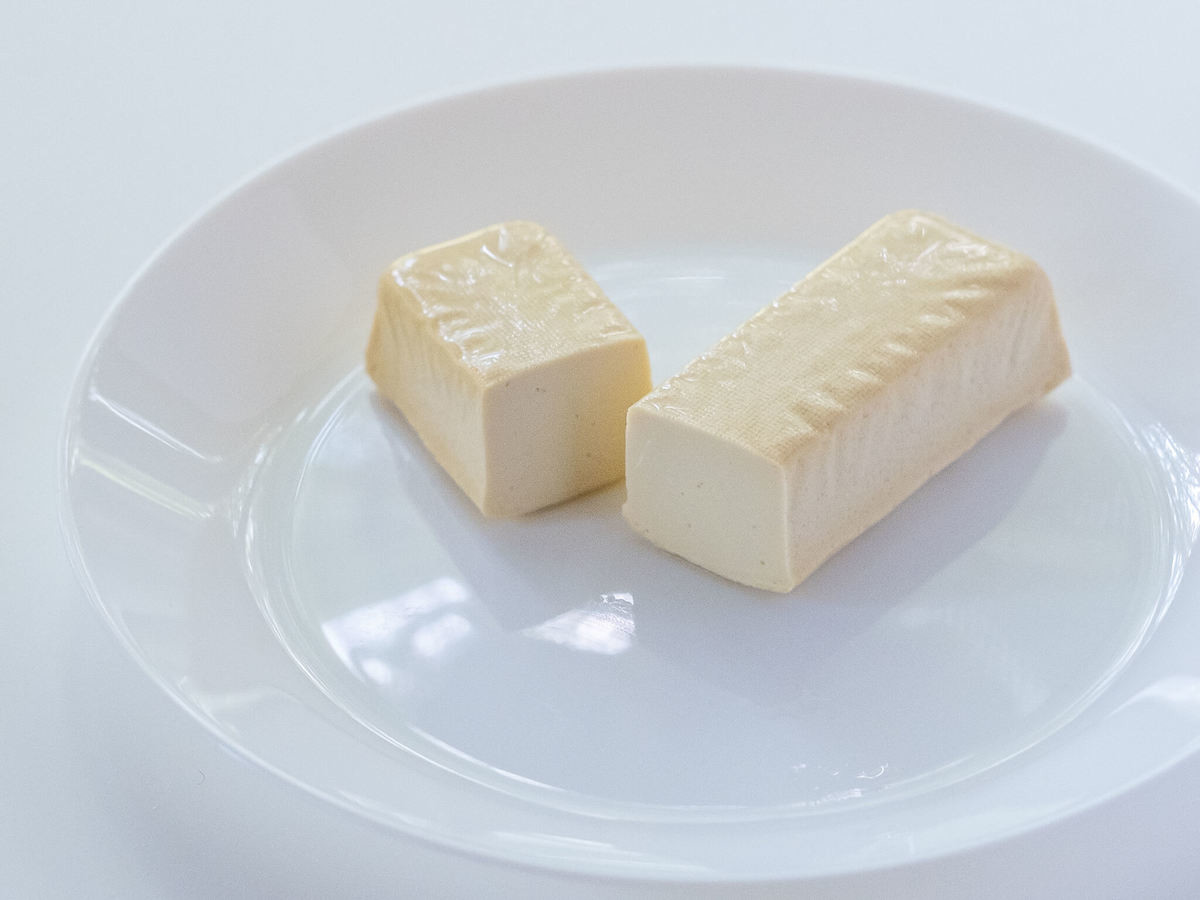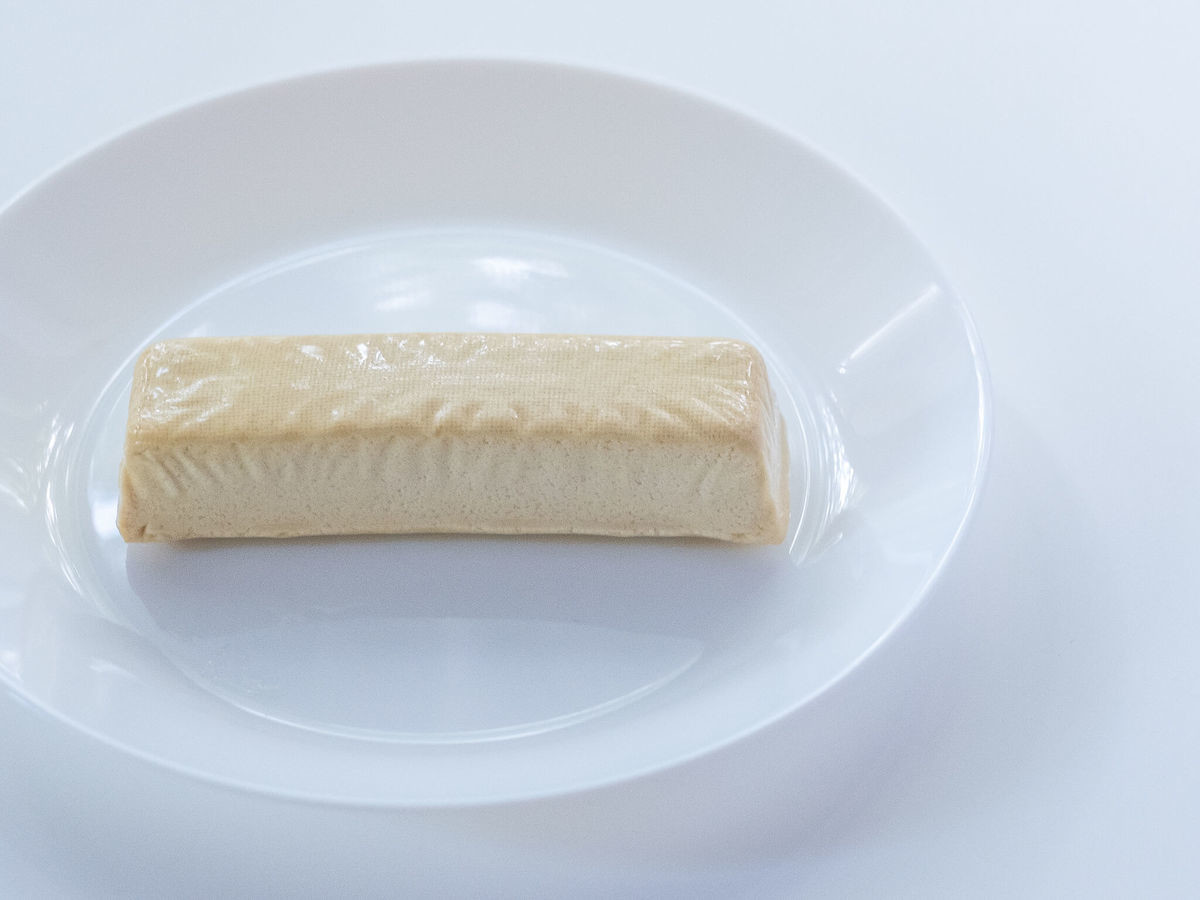予想よりしっかりとした硬さがあり、水分も通常の木綿豆腐にくらべても少ない印象です。だしで味付けがされているからか、表面はほんのり茶色い色合いになっています。