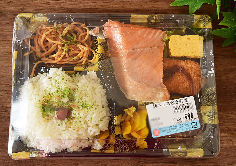 先に紹介した「さば塩焼き弁当」よりもやや割高ですが、大きな鮭ハラスが魅力な「鮭ハラス焼き弁当」646円(税込)。