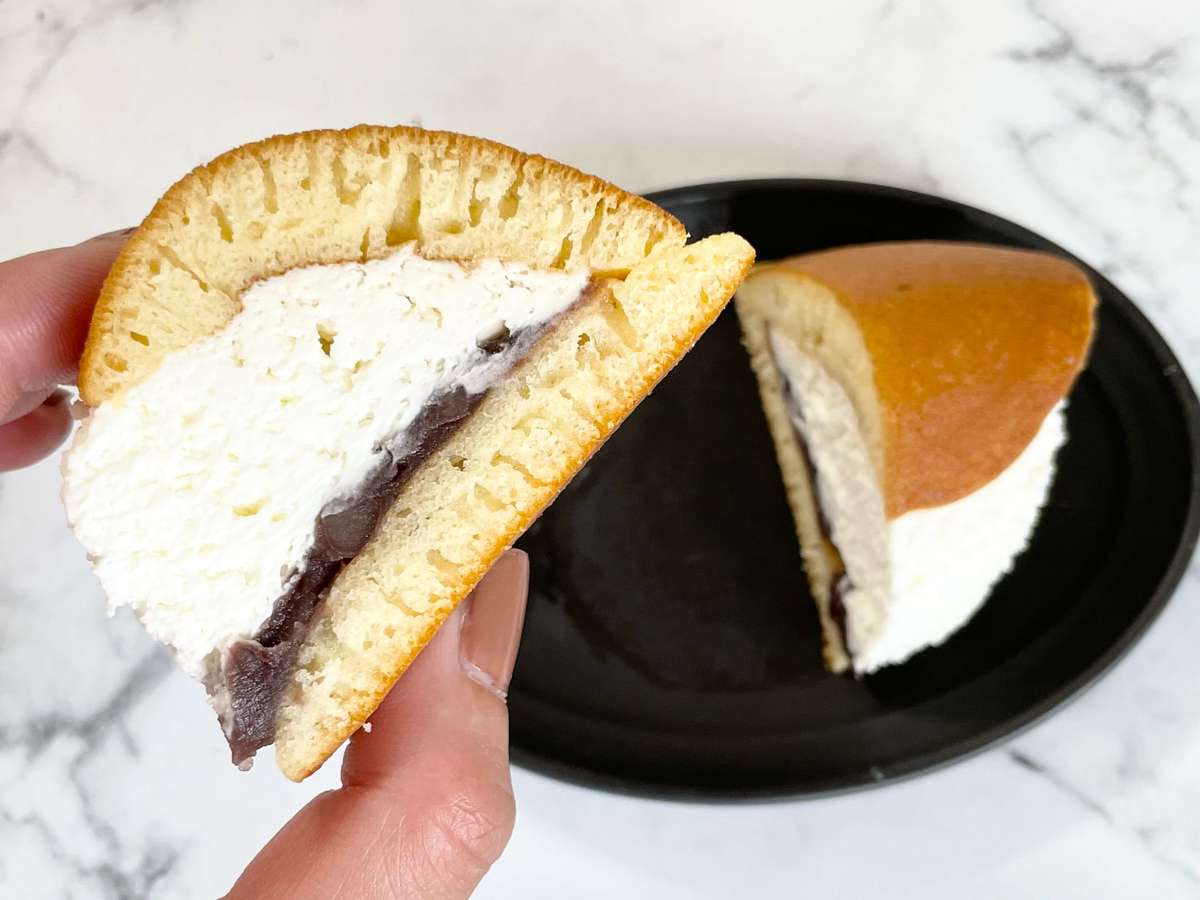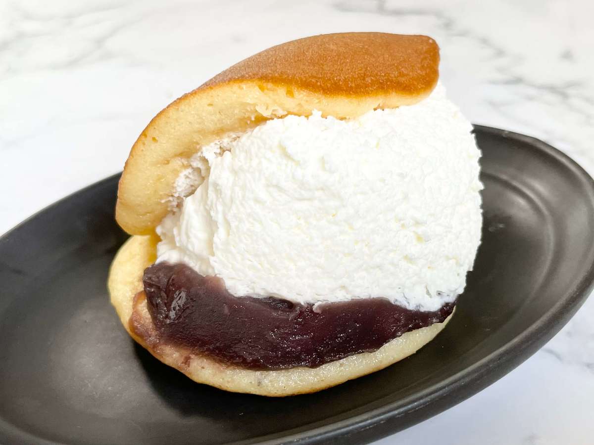 ふんわりと焼き上げたどら焼き生地にたっぷりのホイップクリームとつぶあんが挟まれています。