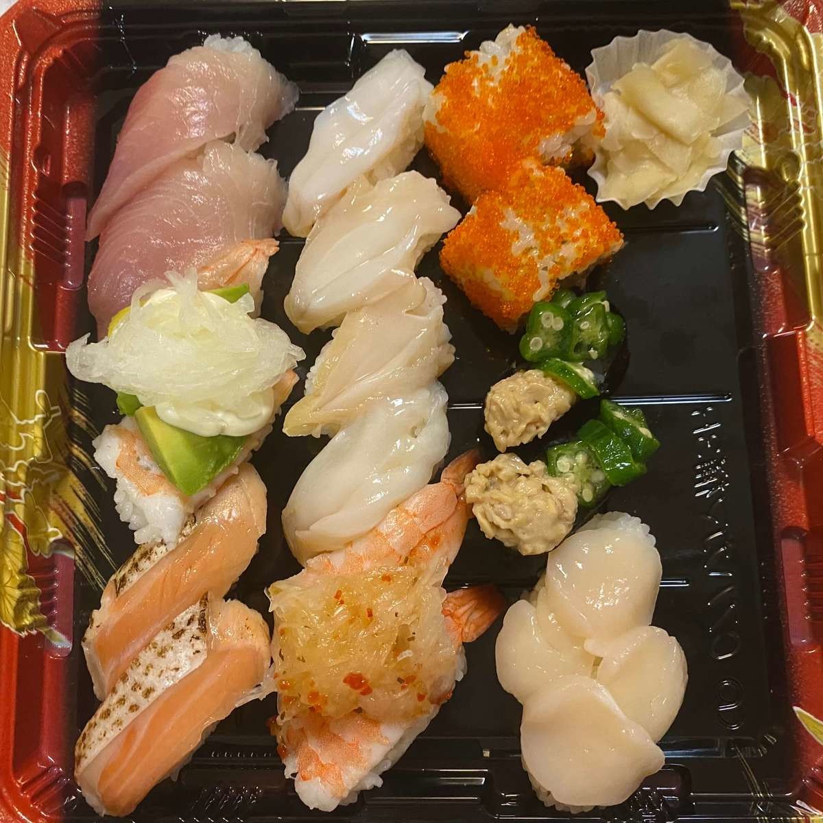 商品名/活〆はまち、えびアボカド、焼とろサーモン、つぶ貝、えびカルパッチョ、いかオクラ、カリフォルニアロール、ほたて(北海道・青森県産)