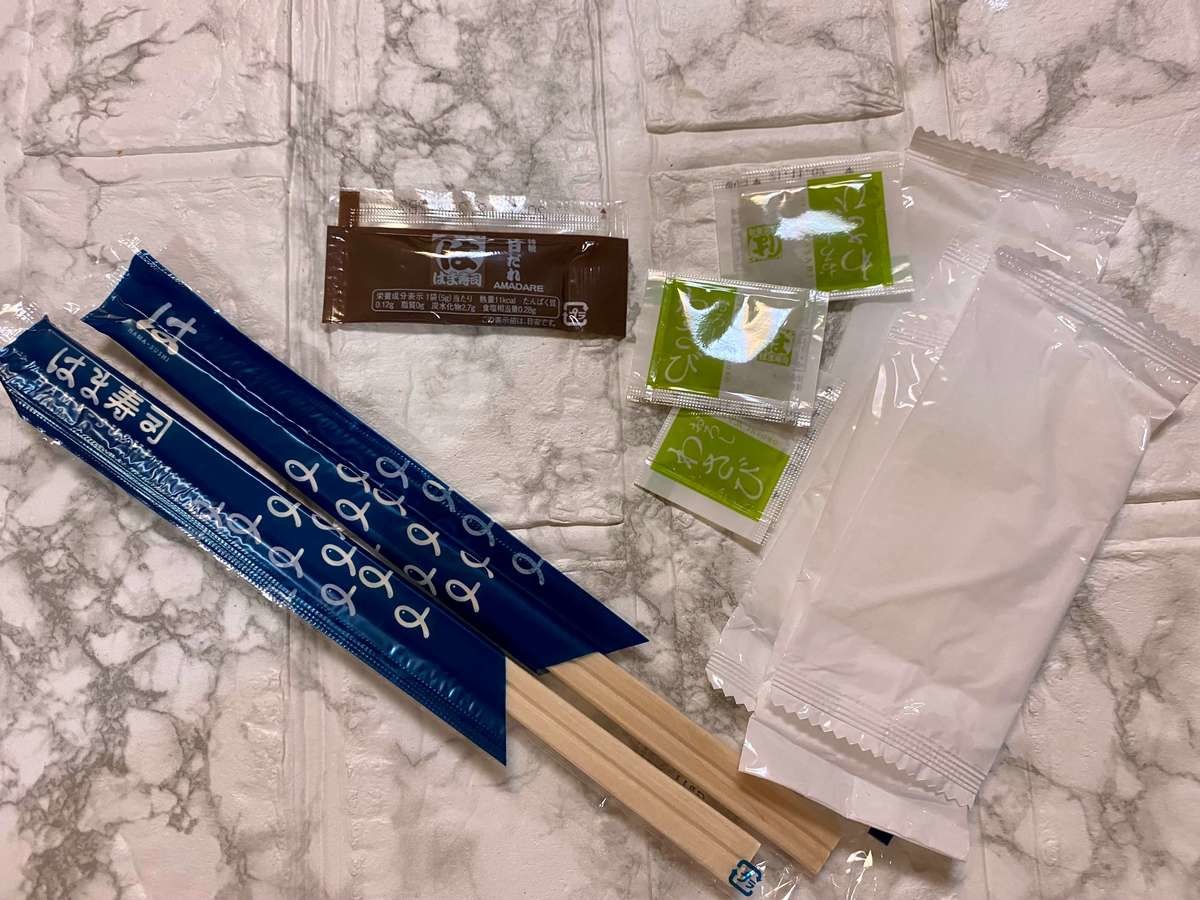 お箸や醤油、わさび、甘だれは、テイクアウト専用ブースに用意されており、自分で取れるようになっていました。はま寿司のテイクアウトはわさびが入っていないので、必要な方は必ずもらってくださいね。