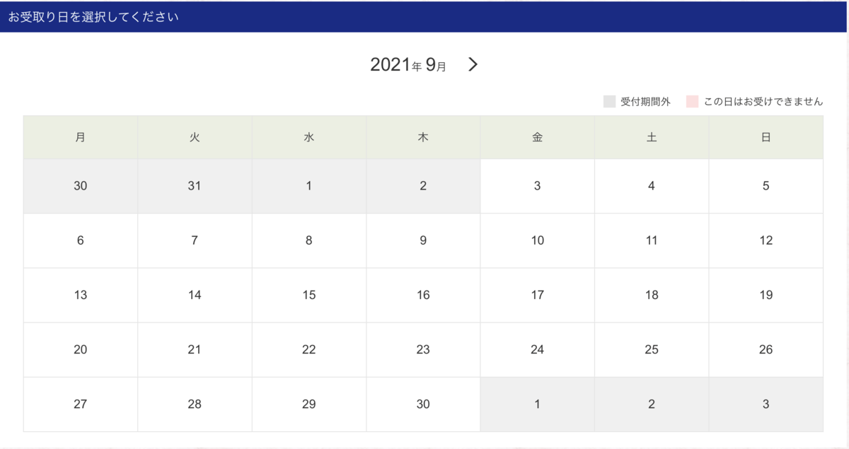受け取り日を選択。1ヶ月以上先の日程も選べます。予めテイクアウトの利用が決まっている場合は、予約しておくと便利です。