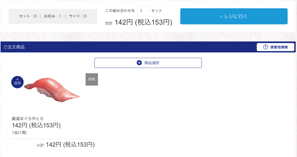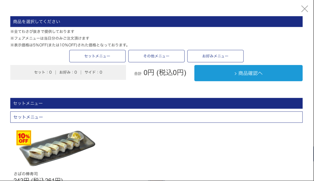 セットメニューやその他メニュー、お好みメニューの中から、メニューを選択。商品名とともに、商品の画像も表示されるので、はま寿司をよく利用しない方でもスムーズに注文できます。