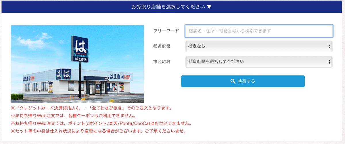 最初に選択するのは、受け取り店舗。フリーワードや都道府県から検索できます。