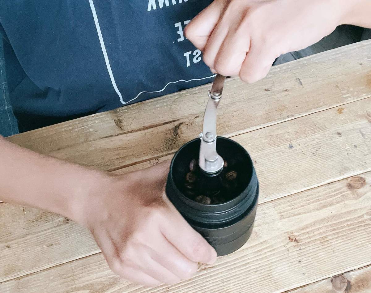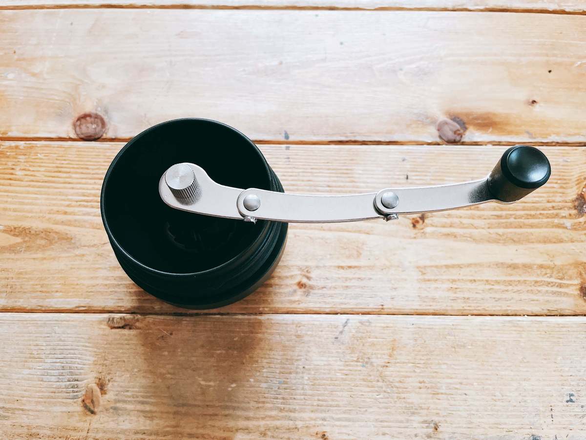 手動式コーヒーミルのハンドルは折り畳んでありますので、使用する際はハンドルを外側に広げて使用します。