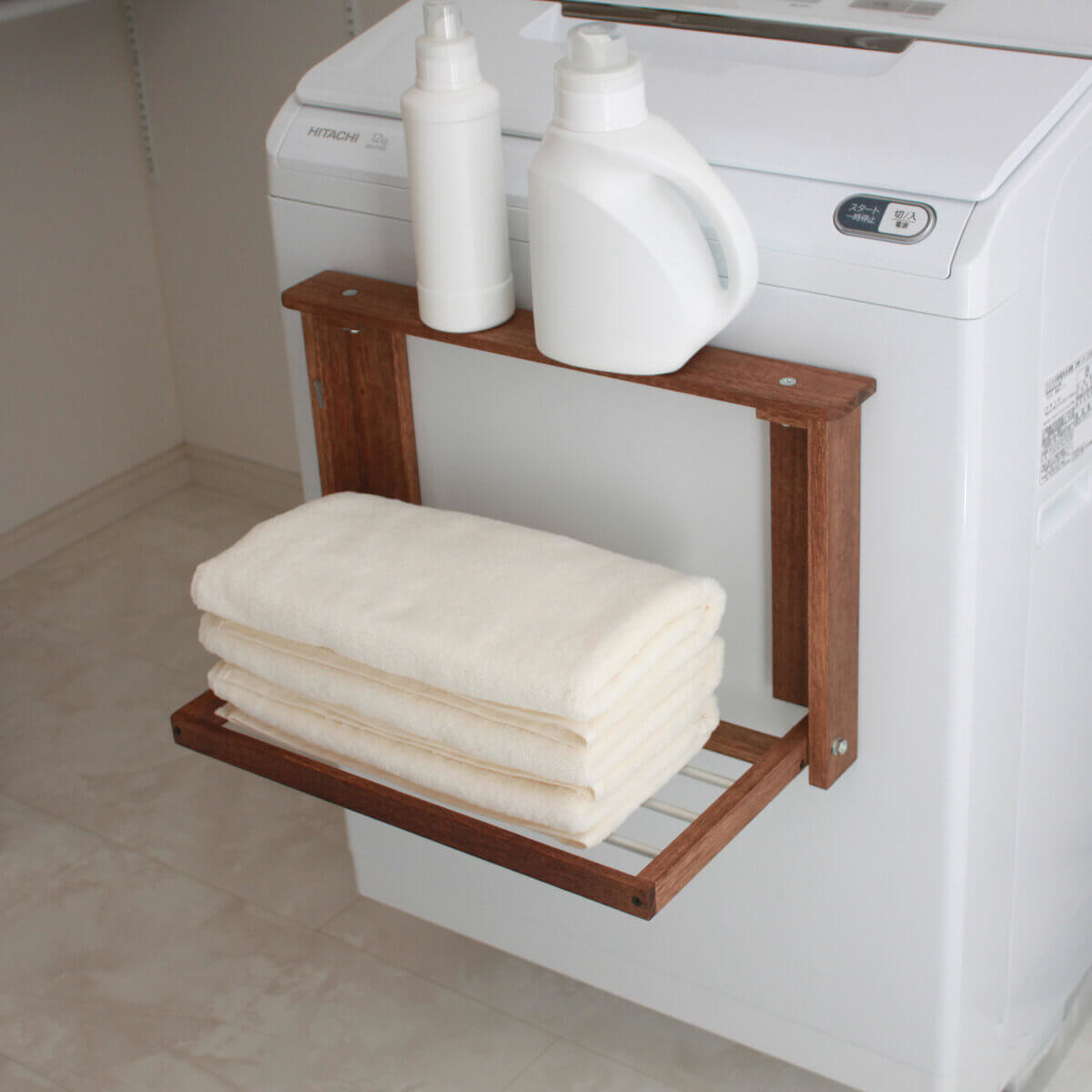 置き場所に困る洗剤置きとして使ったり、折り畳み部分には入浴後のタオル置いたりしても◎。もちろん、物干しとしての利用もできますよ♪