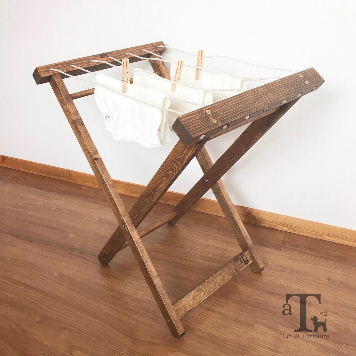 こちらの木製タオルスタンドは、使いたいときだけ出して使わないときははコンパクトに収納できる物干しです。たとえリビングで干したとしても、木材に自然系塗装を施しているため“おしゃれに見せる生活感”としてインテリアの一部に!