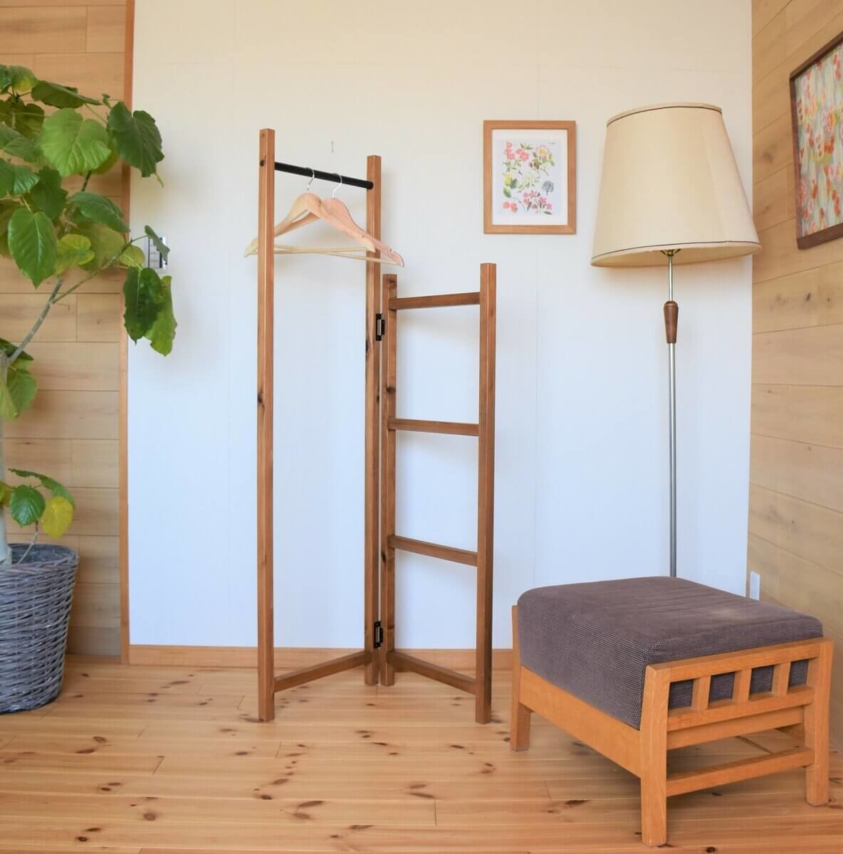 ハンガーラックとして使わないときは、折り畳んだ状態ではしごのように立てかけ、観葉植物や雑貨などを飾るディスプレイ棚としておしゃれを楽しめる2way仕様です。