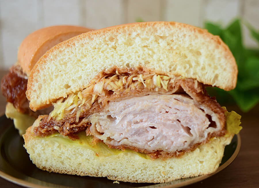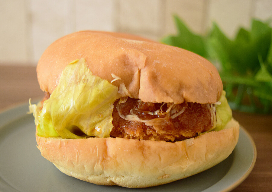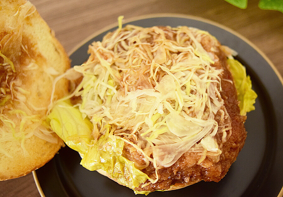 食べ応えのあるバンズの中には、千切りのキャベツとレタス、そしてみるふぃーゆかつがサンドされています。味付けはソースのみとシンプル。