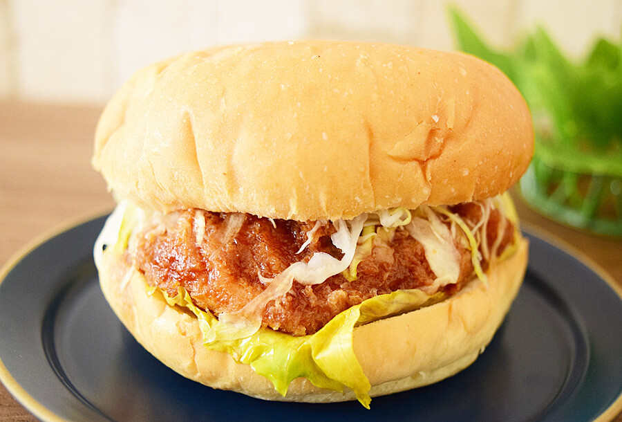 バンズと同じ直径位のひれかつが入っています。「みるふぃーゆかつバーガー」と同様に、ソースで味付けされてますよ。