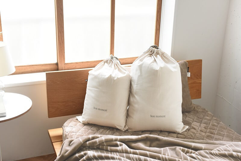 カバーは袋状になっていて、余った口を中に折り込んで使います。ファスナーなどがないので肌当たりが優しく、小さなお子さまと添い寝する際も安心。