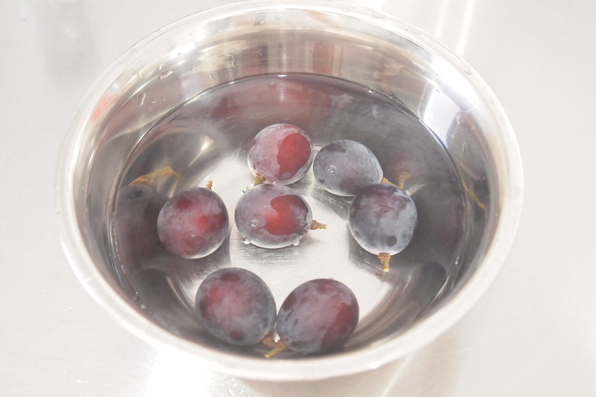 凍らせたぶどうを食べる分だけ冷凍室から取り出し、水につけて半解凍させます。