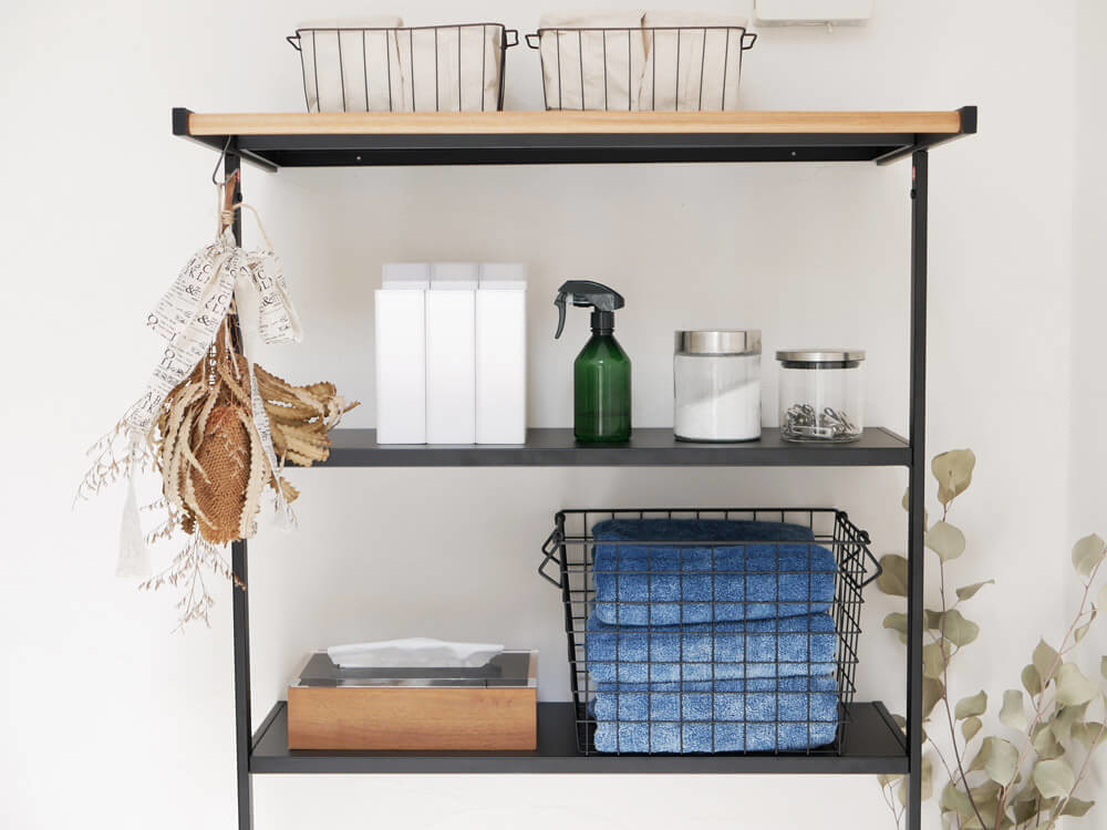 バスタオル、ランドリー小物など生活感の出やすい物も、スタイリッシュでスマートなシェルフに並べれば一気にお洒落な見せる収納に。