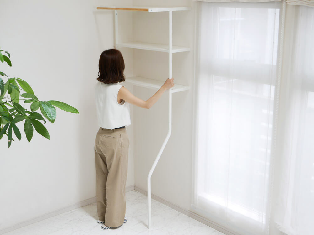 スマートな立て掛け式シェルフでお洒落な空間に