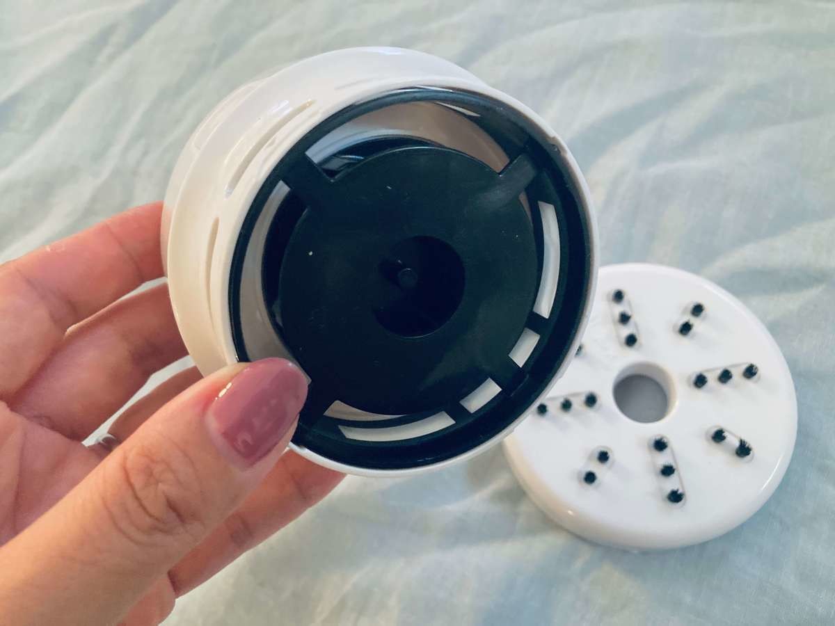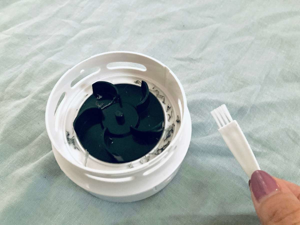 下のブラシ付きのパーツ(ダストケース)は、左に回すと外れます。中には黒い内部ファンと、取り外し可能なフィルターが付いていました。