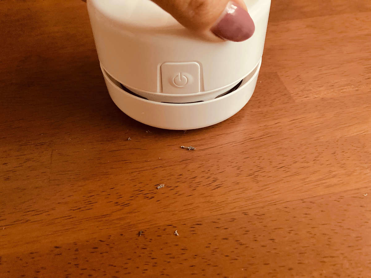 仕事や勉強をした後は、机の上が汚れてしまうんですよね...。早速、机の上の消しゴムのカスを吸ってみましょう。