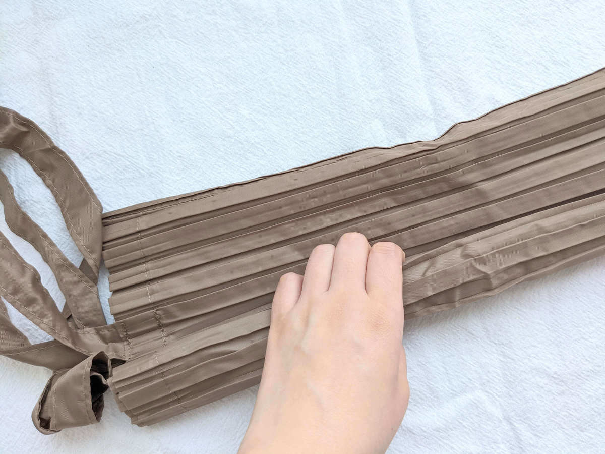 プリーツ仕様ということで、折りシワが目立ちにくいところも好ポイントです。 ただし、唯一の欠点は内ポケットや収納袋が付いていないこと。