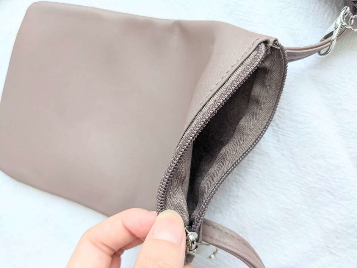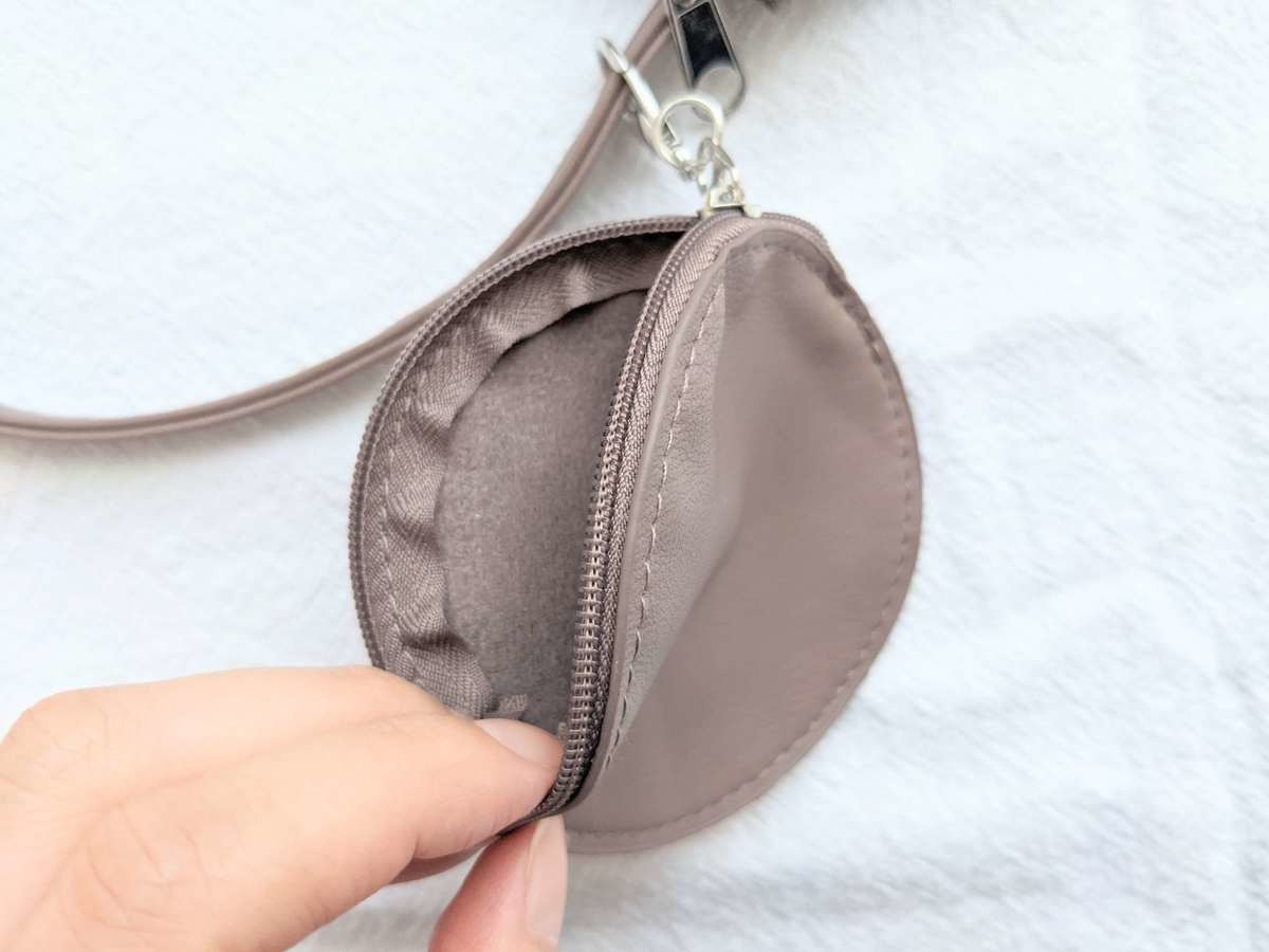 細部まで丁寧につくられていて、ファスナー付きなので中身が落ちる心配はありません。 ミニサイズなので小さめの財布なら入りますが、長財布はちょっと厳しいかもしれませんね。