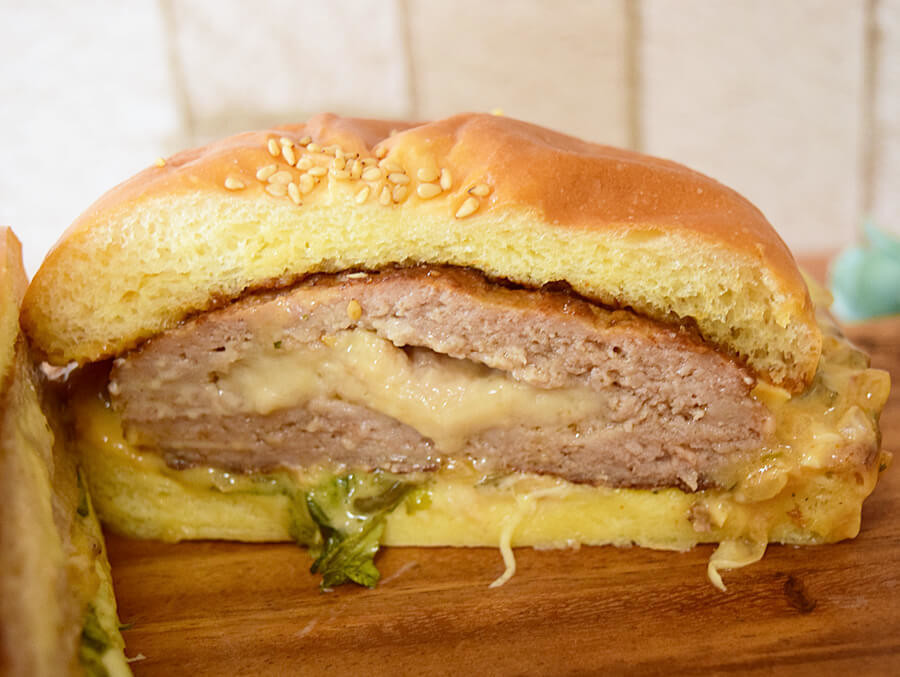 半分にカットしてみると、ハンバーグがとっても肉厚!しかもハンバーグの中にはとろけているチーズも!ハンバーグはつなぎ感が少なくて、肉肉しさが伝わってきます。